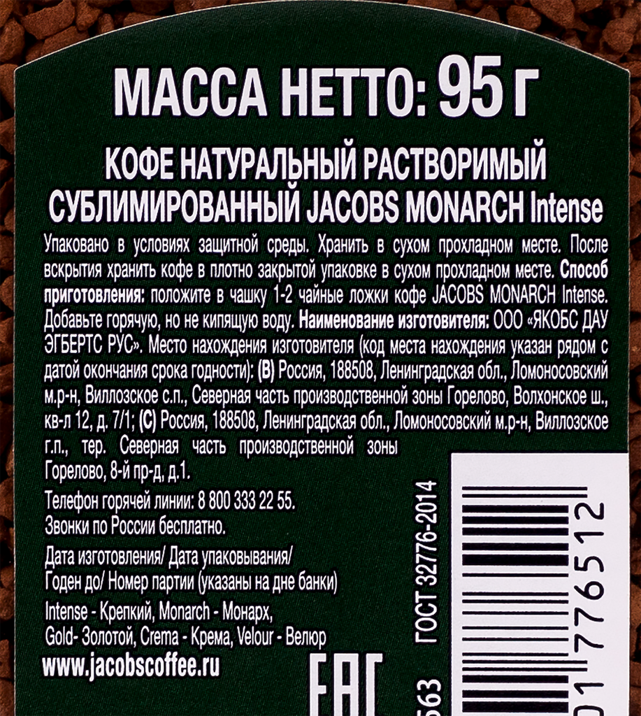 Кофе растворимый JACOBS Monarch intense/Monarch Original Intense натуральный сублимированный, 95г интересное: