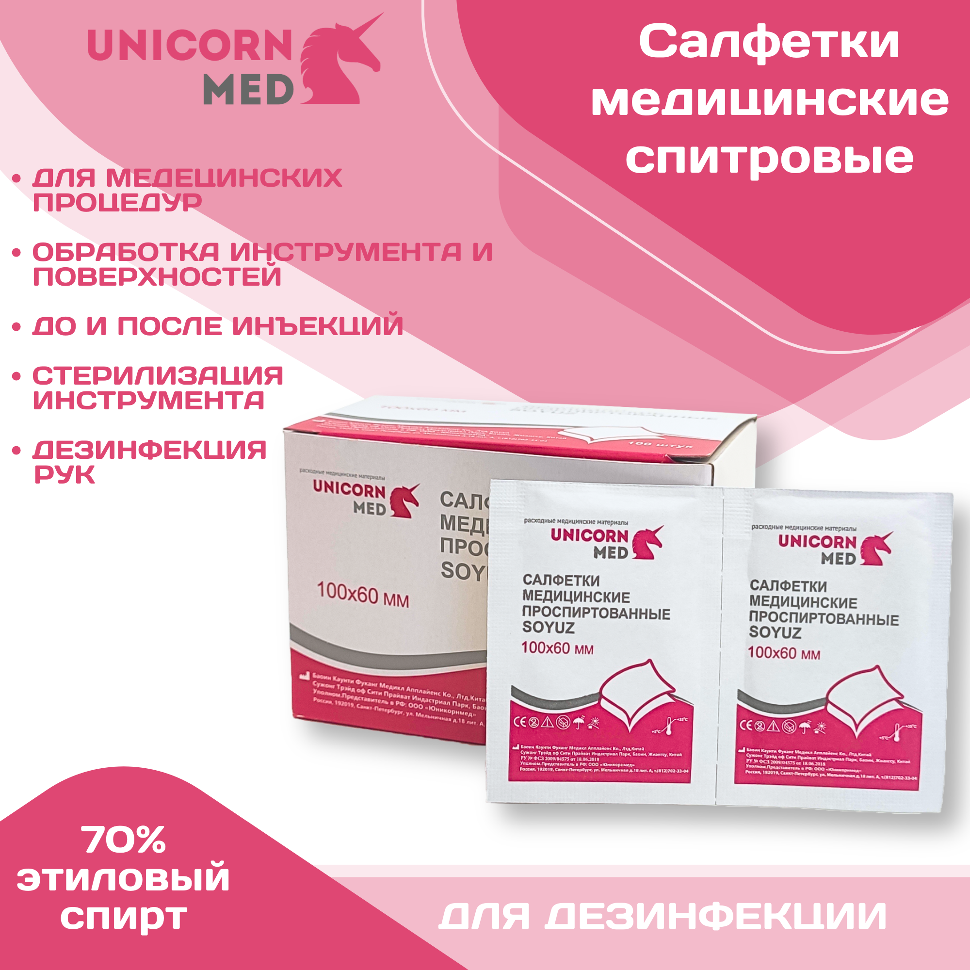Салфетки спиртовые медицинские 100x60 мм 100 шт "SOYUZ" UnicornMed Антисептические антибактериальные дезинфицирующие для инъекций