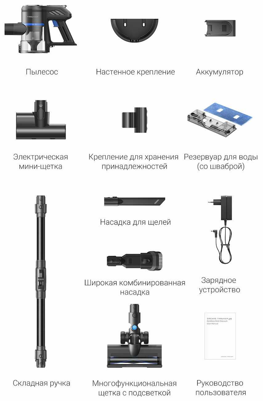| В комплекте | адаптер для уборки труднодоступных мест, зарядное устройство, комбинированная насадка, лазерная насадка с мягким валиком, мини-электрощетка, насадка для автомобиля, насадка для ламината и паркета, насадка для мягкой мебели, насадка для твердых покрытий мебели, насадка с мягким валиком, настенный держатель, турбощетка, угловая насадка, удлинительная трубка/шланг, универсальная насадка для влажной уборки, универсальная насадка для сухой уборки, фильтр тонкой очистки, щелевая насадка, щеточка для очистки |