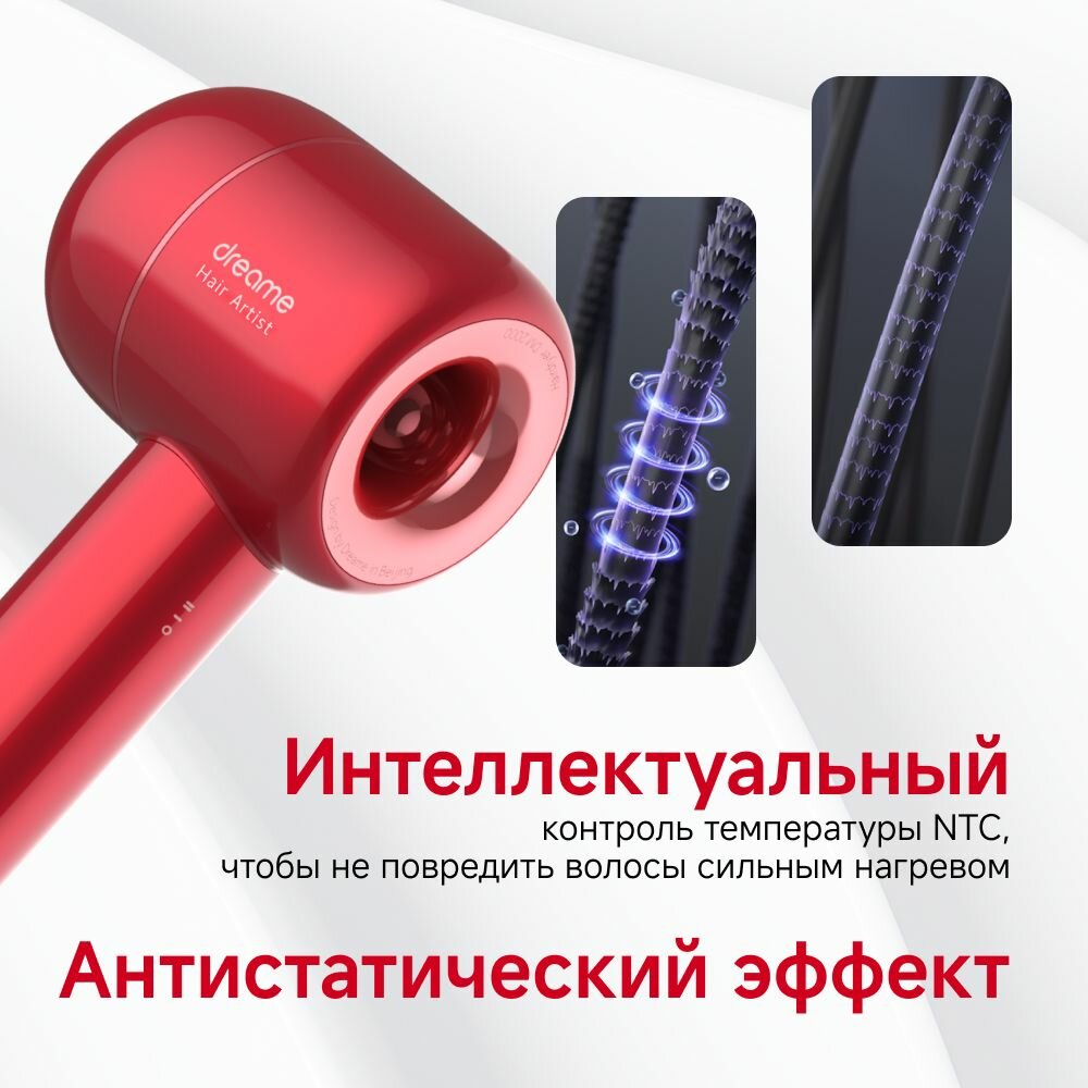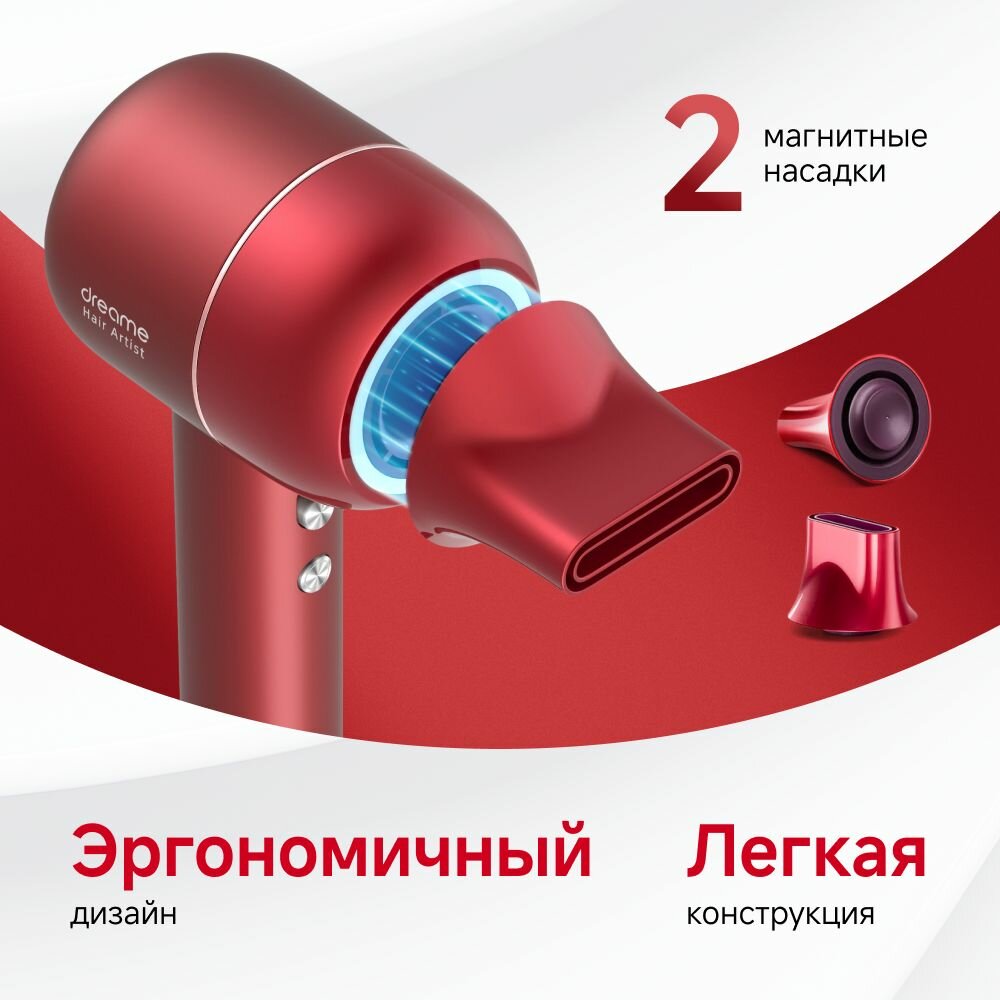 Купить Фен для волос Dreame Hair Artist Red AHD5-RE0, 3 температурных режима, 2 скорости, светодиодный индикатор, 2 магнитные насадки, красный