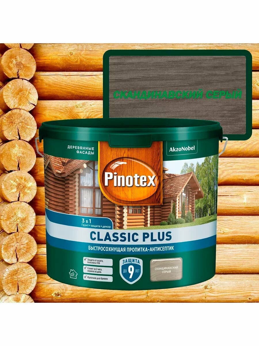 Пропитка-антисептик быстросохнущая для защиты древесины Pinotex Classic Plus, полуматовая (9л) скандинавский серый