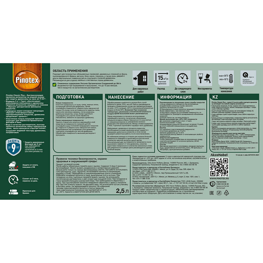 PINOTEX CLASSIC Plus RU Пропитка Лиственница 2,5л
