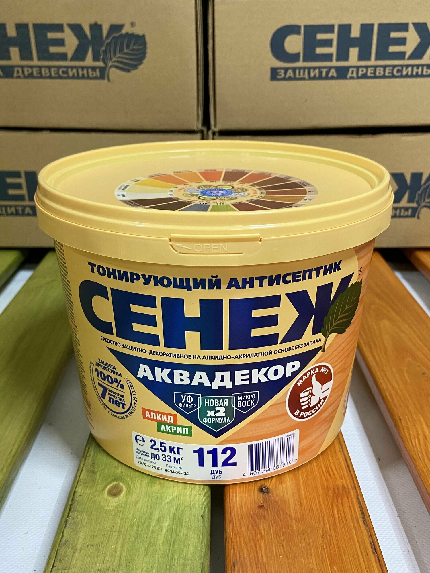 Сенеж аквадекор. Цвет 112 Дуб. Тонирующий антисептик на алкидно-акрилатной основе с УФ фильтром и воском для долговременной защиты и отделки древесины. Ведро массой нетто 2,5 кг.