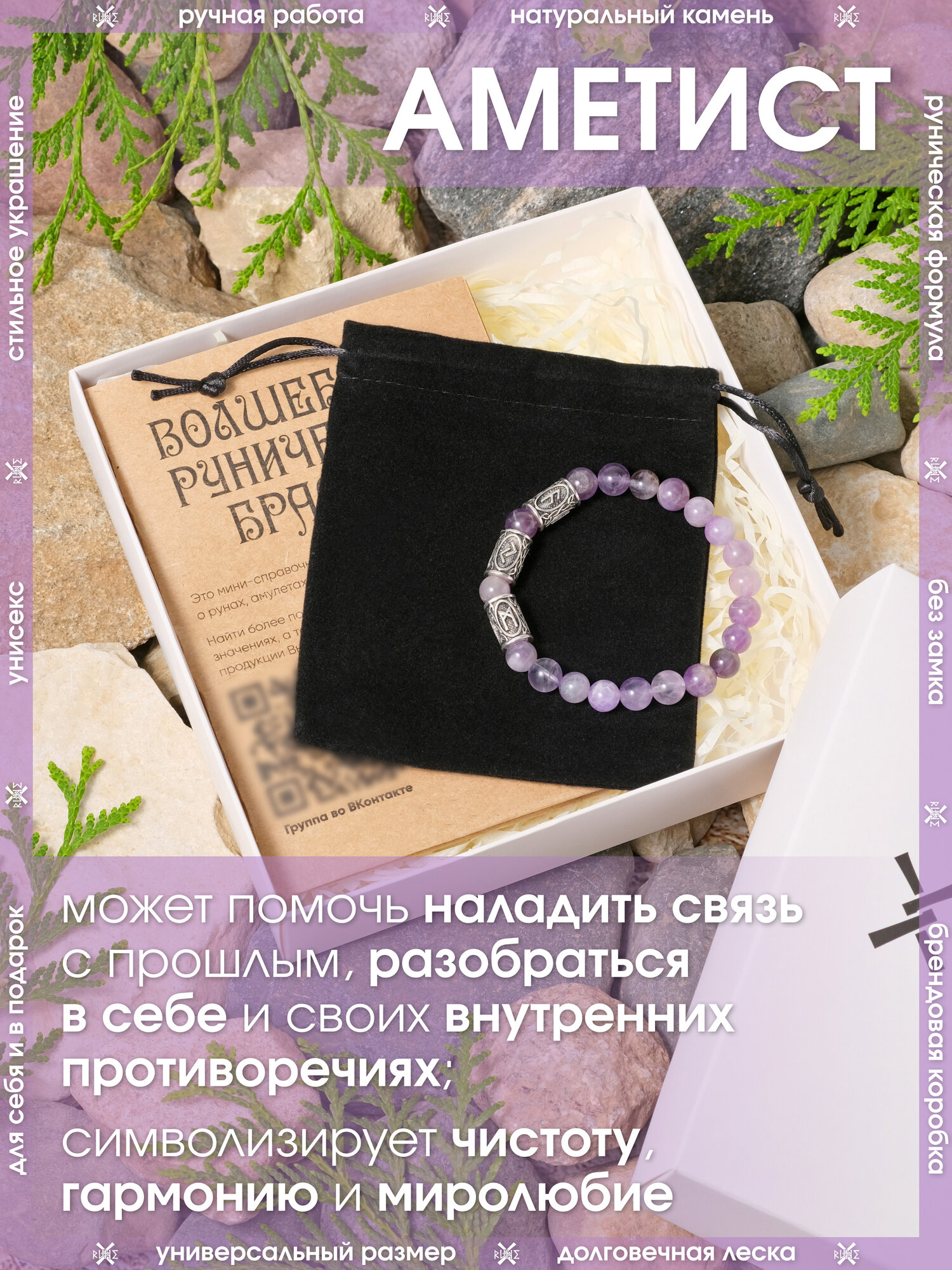 Купить Браслет из натурального камня Аметиста/Талисман с рунами из металла/Браслет из бусин, бижутерия, украшение