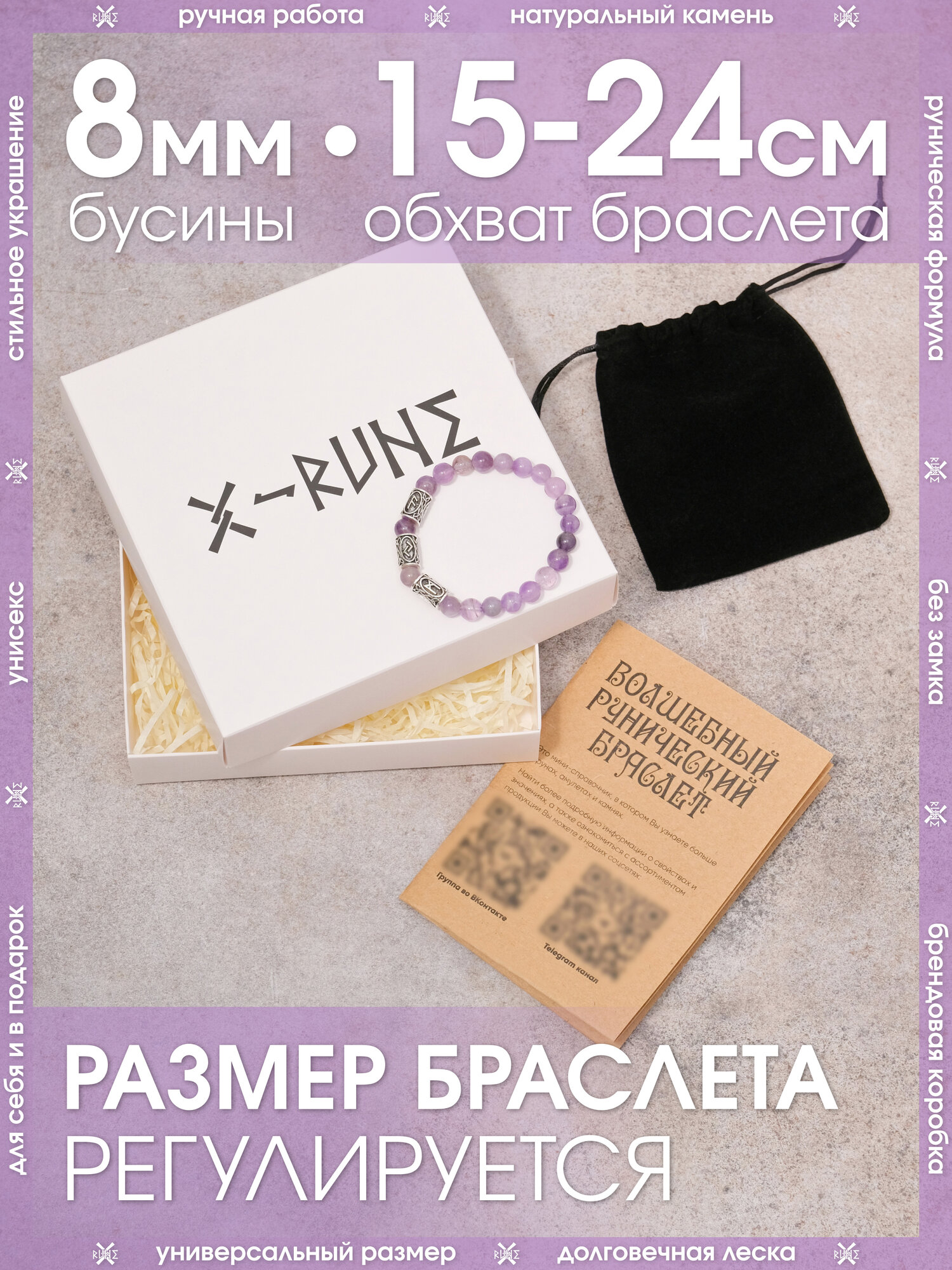 СохранитьБраслет из натурального камня Аметиста/Талисман с рунами из металла/Браслет из бусин, бижутерия, украшение интересное: