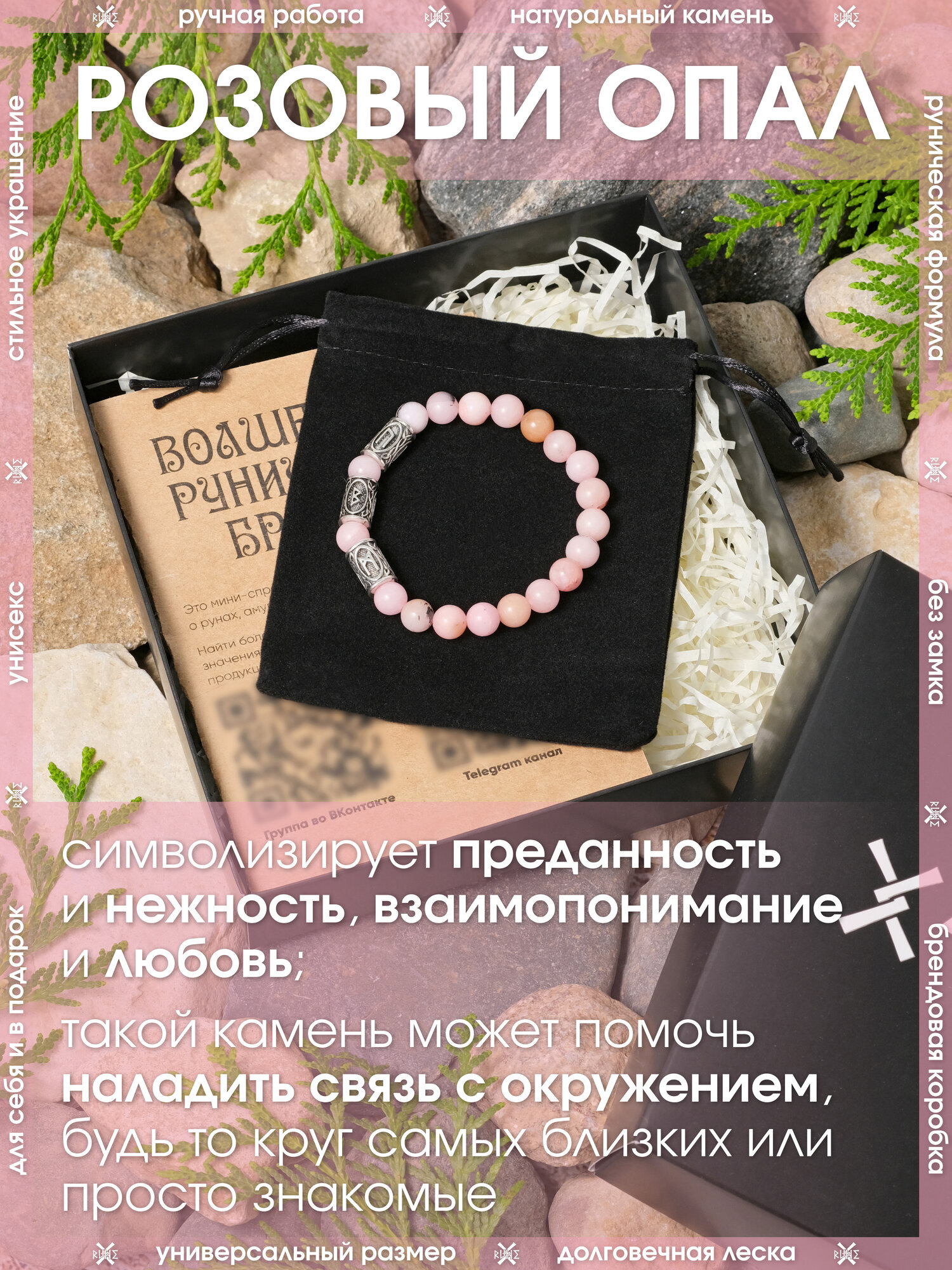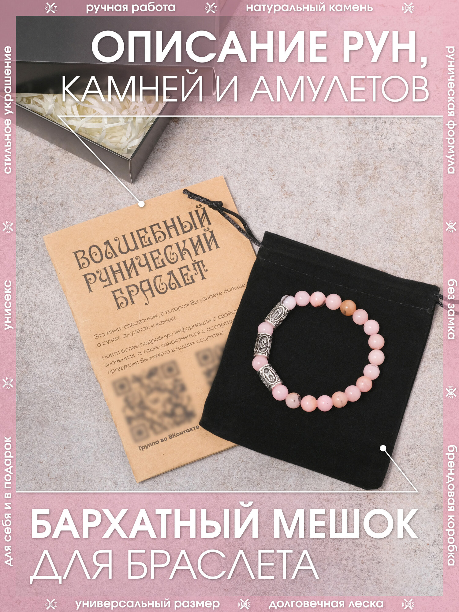 СохранитьБраслет из натурального камня Розового опала/Талисман с рунами из металла/Браслет из бусин, бижутерия, украшение интересное: