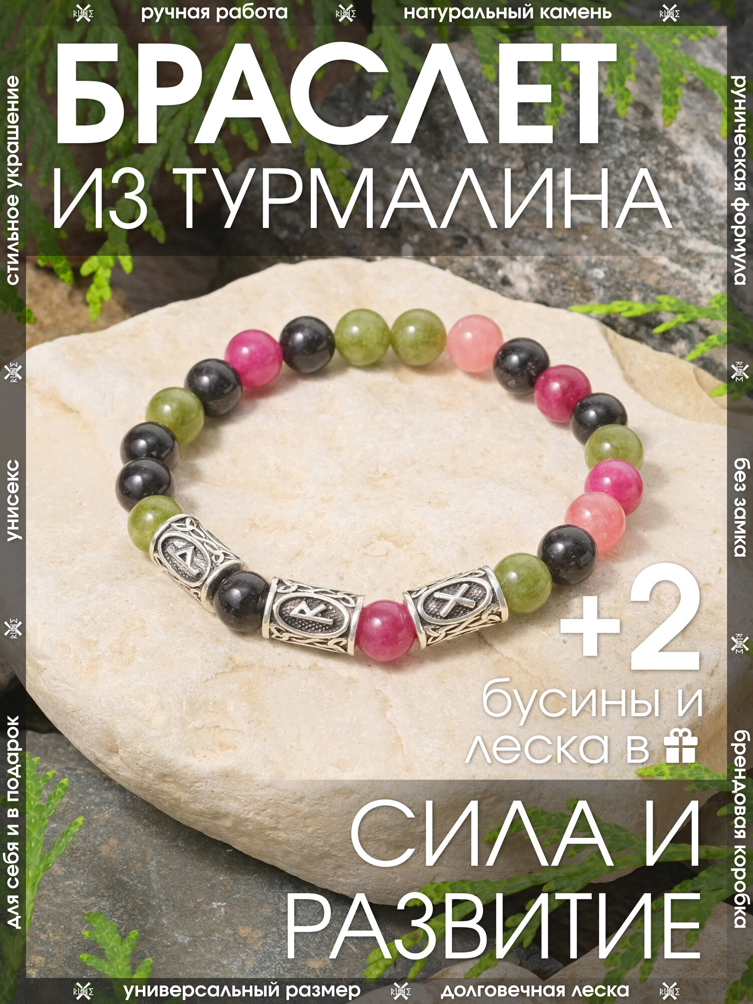 СохранитьБраслет из натурального камня Турмалина/Талисман с рунами из металла/Браслет из бусин, бижутерия, украшение интересное: