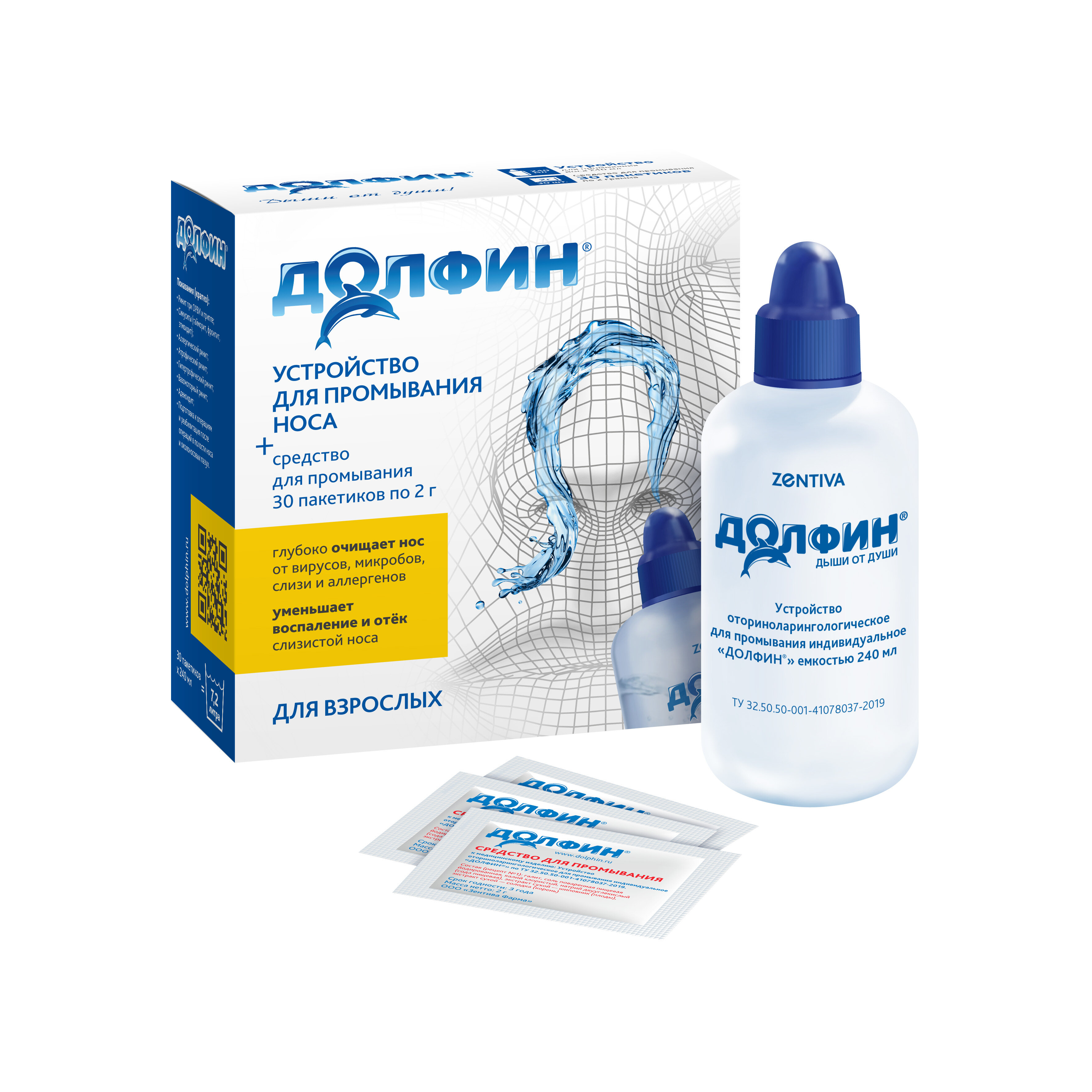 Долфин Для взрослых устройство + средство д/промывания носа пак. (Рецепт №1), 240 мл, 2 г, 30 шт.