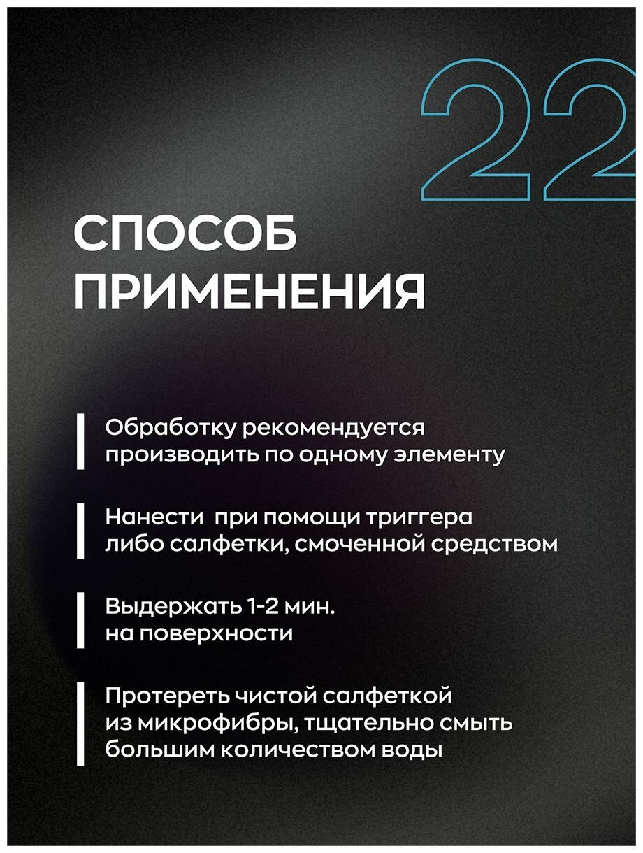 | Способ применения | Наносите состав на предварительно очищенную поверхность! Тщательно встряхните флакон и нанесите средство на кузов с помощью распылителя. Затем протрите загрязнения микрофибровой салфеткой. Смойте остатки состава водой. При необходимости повторите процедуру. Проводите очистку постепенно, обрабатывая каждый элемент по очереди. Не наносите состав на разогретую поверхность |