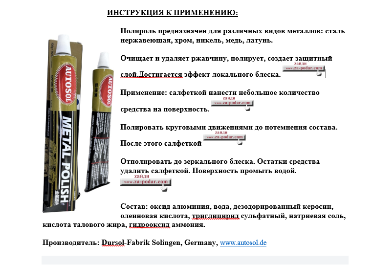 | Дополнительная информация | Инструкция к применению: Поверхность должна быть сухой! Нанесите небольшое количество пасты на мягкую ткань или губку, затем аккуратно и равномерно нанесите на поверхность металла. Оставьте пасту на несколько минут, затем тщательно протрите поверхность до полного удаления пасты. Результат будет заметен сразу - металл станет блестящим и выглядеть как новый. |