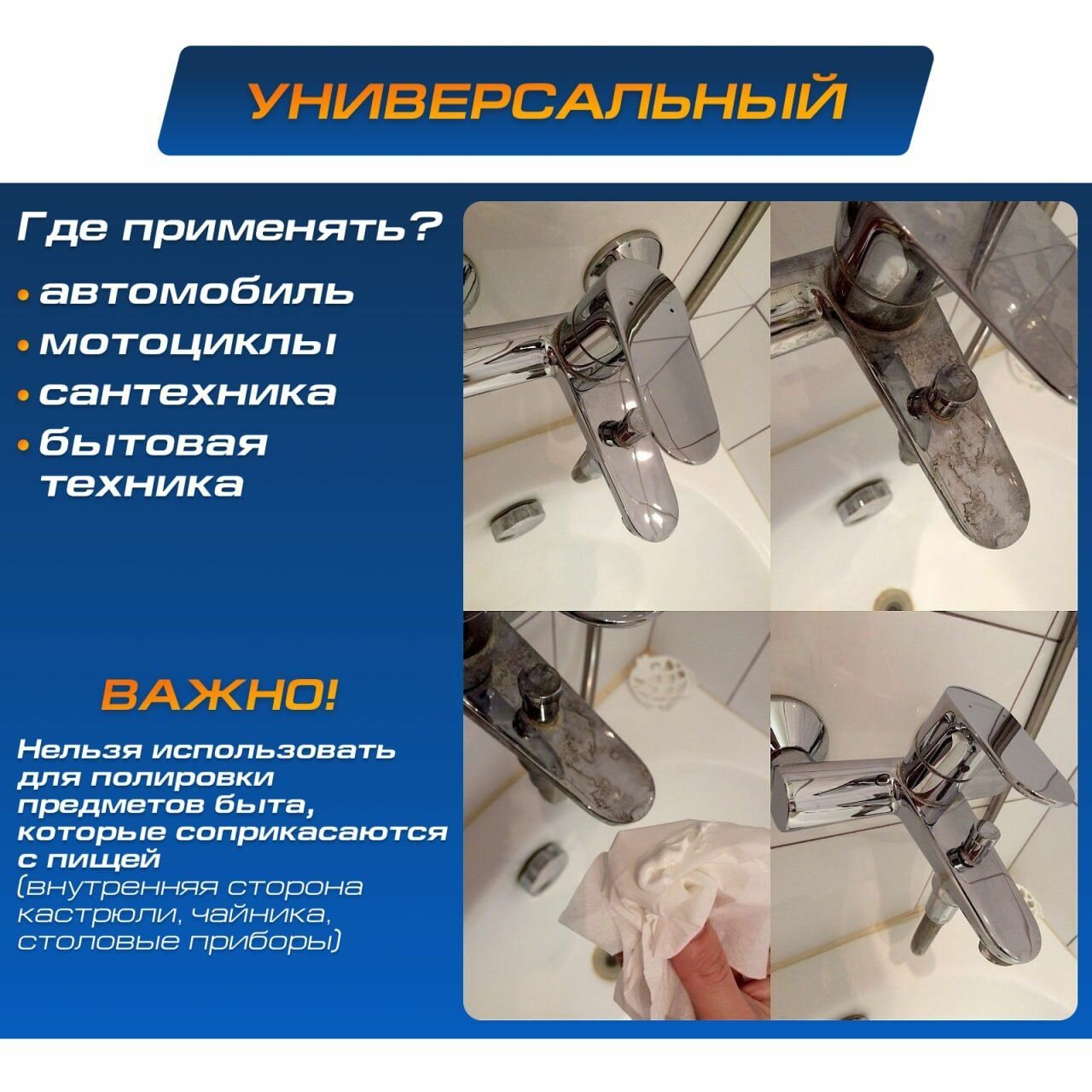 | Способ применения | Полировочная паста наносится на поверхность и полируется до максимального блеска. Время полировки в каждом случае индивидуально. Полировальный состав "работает" от трения, не от количества. Не стоит сразу наносить много пасты. |