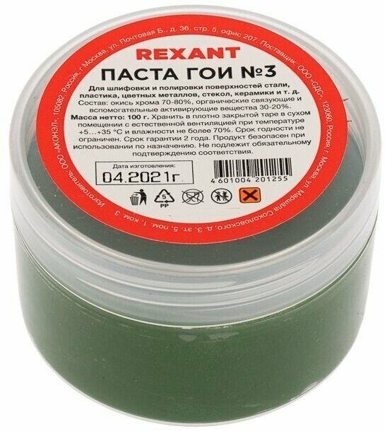 Купить Полировальная паста ГОИ № 3 REXANT для средней шлифовки и полировки поверхностей, банка 100 грамм