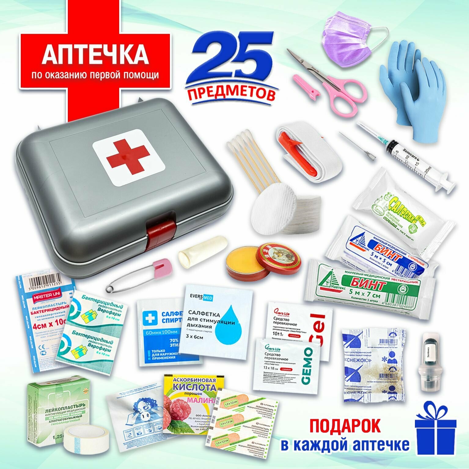 | Состав | 1- Сумка (аптечка); 2- Жгут кровоостанавливающий; 3- Бинт стерильный; 4- Бинт нестерильный; 5- Ножницы; 6- Маска; Салфетка спиртовая (2шт.); 7- Салфетка с нашатырным спиртом (2шт.); 8- Аскорбиновая кислота; 9- Бальзам "Китайская звёздочка"; 10- Лейкопластырь фиксирующий; 11-Лейкопластырь бактерицидный (2шт.); 12-Лейкопластырь бактерицидный (10 шт.); 13- Зелёнка валик; 14- Напальчник; 15- Шприц медицинский; 16- Влажная салфетка антибактериальная; 17- Средство противоожоговое и ранозаживляющее; 18- Средство перевязочное кровоостанавливающее; 19- Влажные салфетки (Подарок); 20- салфетки спиртовые; 21- маска с клапаном для и д; 22- пакет гипотермический; 23 - булавка; 24- перчатки; 25- палочки; 26 - диски; 27 - инструкция по оказанию первой медицинской помощи аптечки |