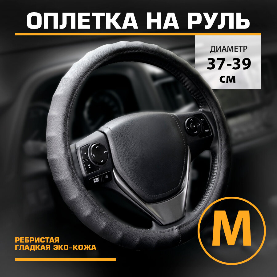 Оплетка руля "M" d37-39 см ребристая, гладкая иск. кожа, черная KRAFT KT 800303