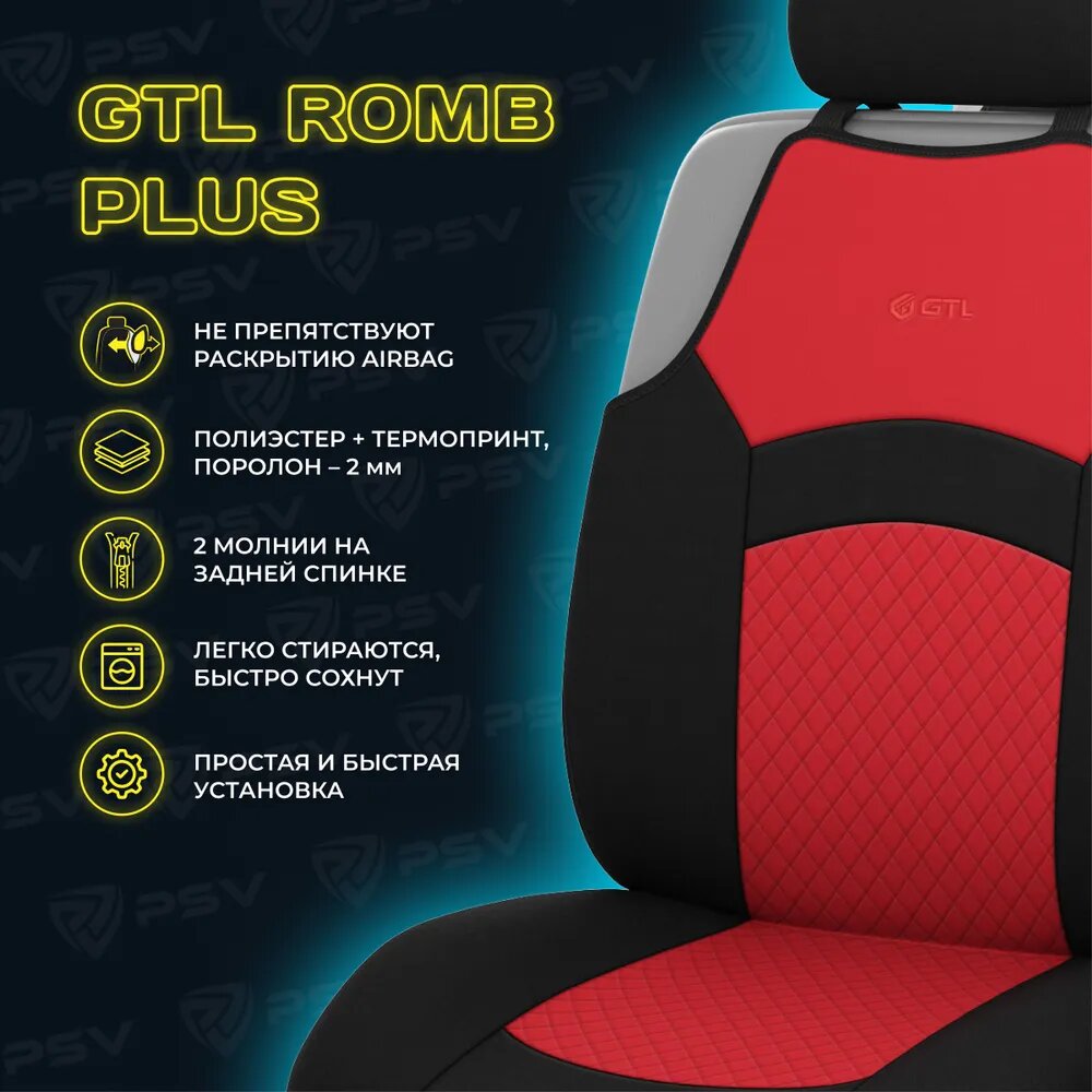 | Дополнительная информация | Чехлы-майки GTL Romb Plus отлично впишутся в интерьер салона автомобиля и защитят сиденья машины от истирания и случайных пятен. Форма майки обладает массой преимуществ: защищает только используемую поверхность сиденья, не препятствует раскрытию подушек безопасности (AirBag), а также не требует демонтажа подголовников при установке. Универсальный размер чехлов позволяет применять их к большинству легковых автомобилей. Чехлы-майки легко снимаются и одеваются, поэтому они просты в чистке и удобны в эксплуатации. |