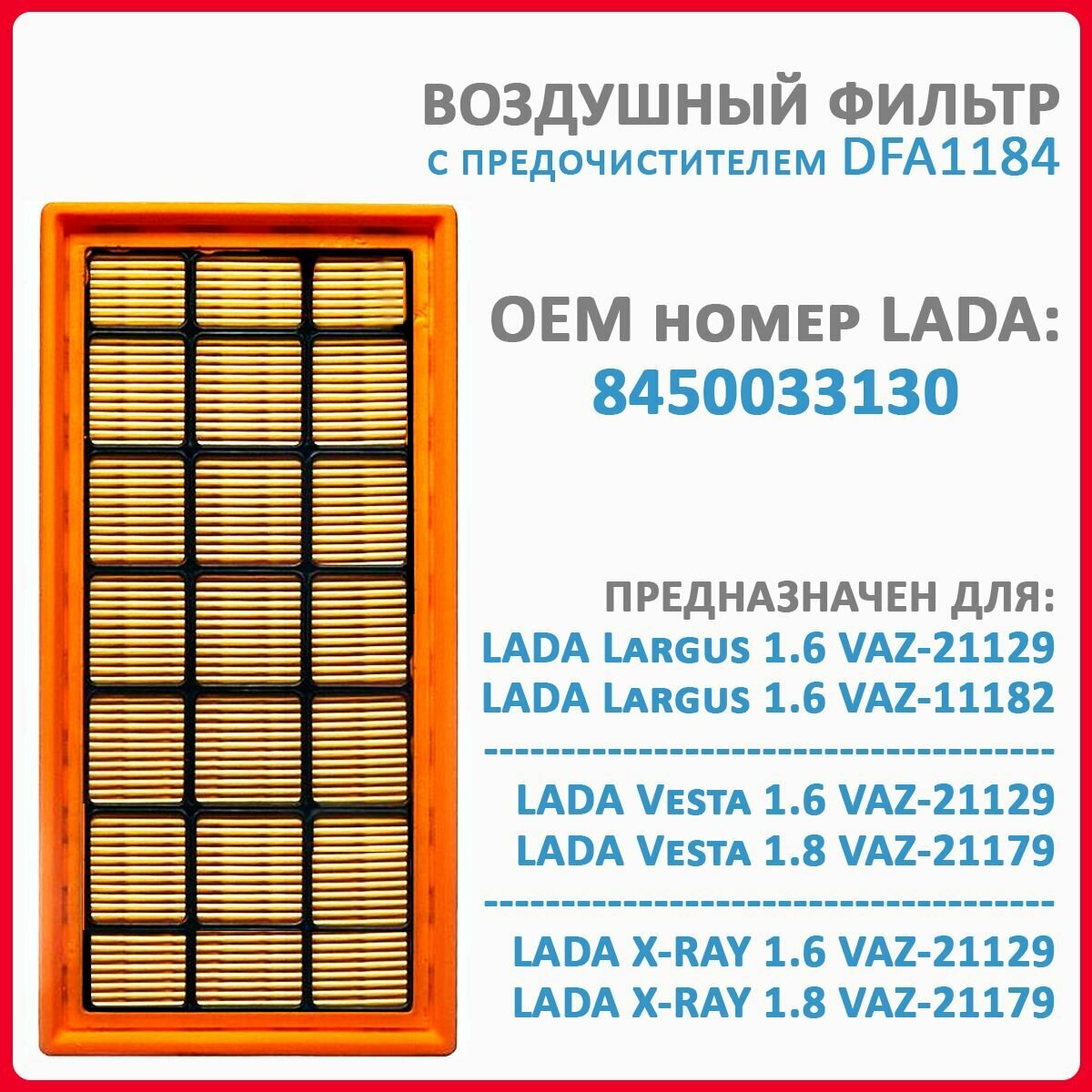 Воздушный фильтр Lada (Лада) 8450033130 для: Largus (Ларгус)/ Vesta (Веста)/ X-Ray; Xray (Икс Рей) ВАЗ-21129; ВАЗ-21179; H4Mk; 1.6, 1.8, от 2019г. - DOUBLE FORCE DFA1184 интересное: