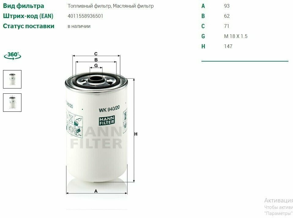 Топливный фильтр MANN-FILTER WK 940/20 интересное: