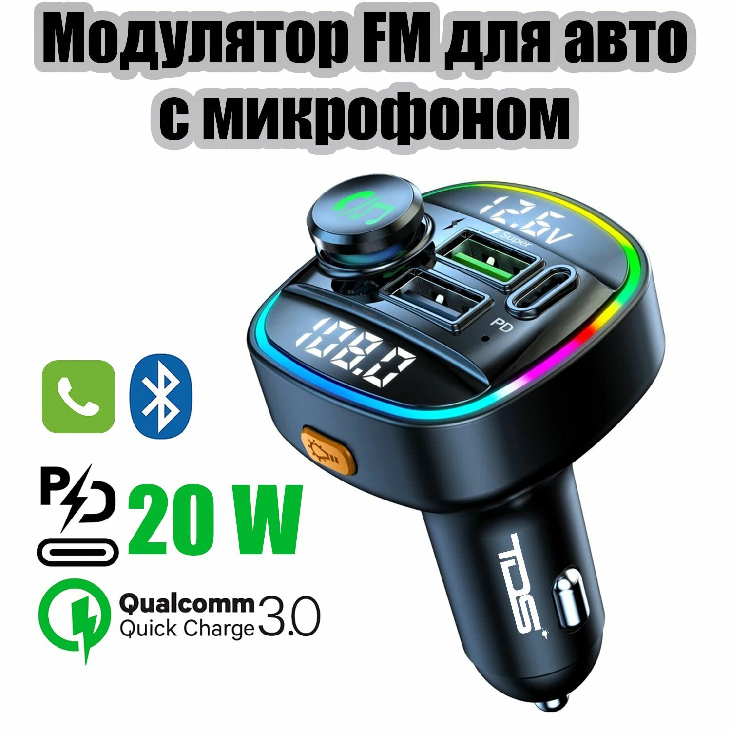 Орбита / TS-CAF120 FM-трансмиттер с bluetooth/микрофоном/ для автомобиля/ зарядник QC 3.0 для авто в прикуриватель