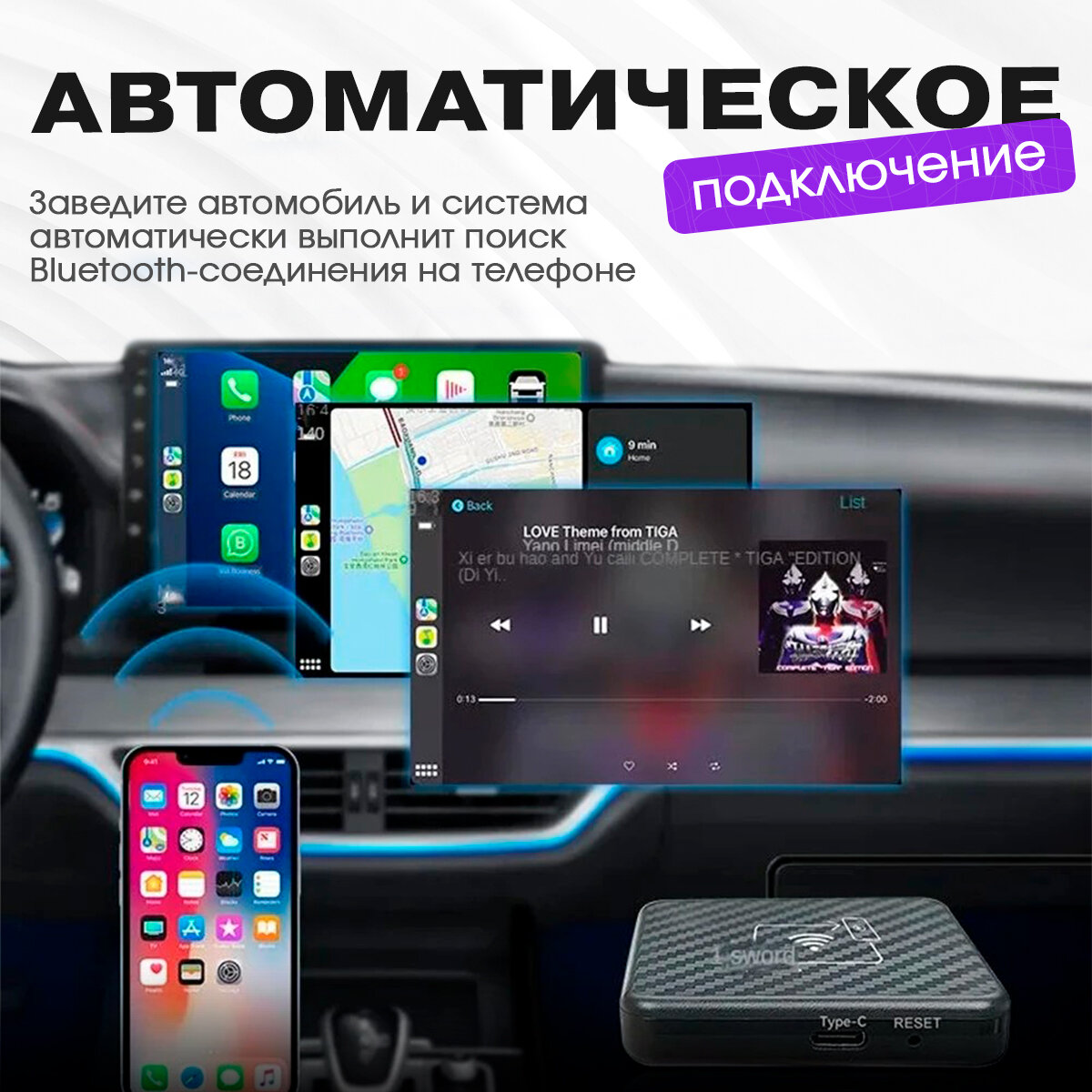 Беспроводной автомобильный bluetooth адаптер Carplay / Android Auto интересное: