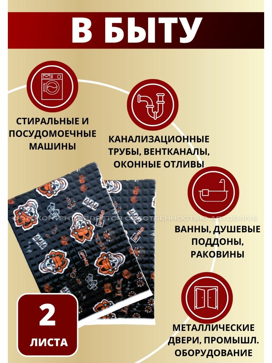 СохранитьШумоизоляция для автомобиля Блек Джек 2 листа. Толщина 2,7 мм = 4 мм. Виброизоляция авто, вибропласт, вибродемпфер, шумка в машину. Шумоизоляция для дверей, крыши, потолка, пола, багажника, арок Шумоff Black Jack. Шумоизоляция стояка, труб, ванны интересное: