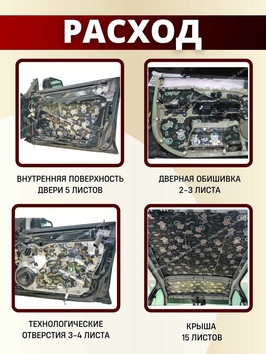 | Место применения | виброизоляция / для арок / для багажника / для дверей / для зазоров / для капота / для пола / для потолка / теплоизоляция / шумоизоляция |