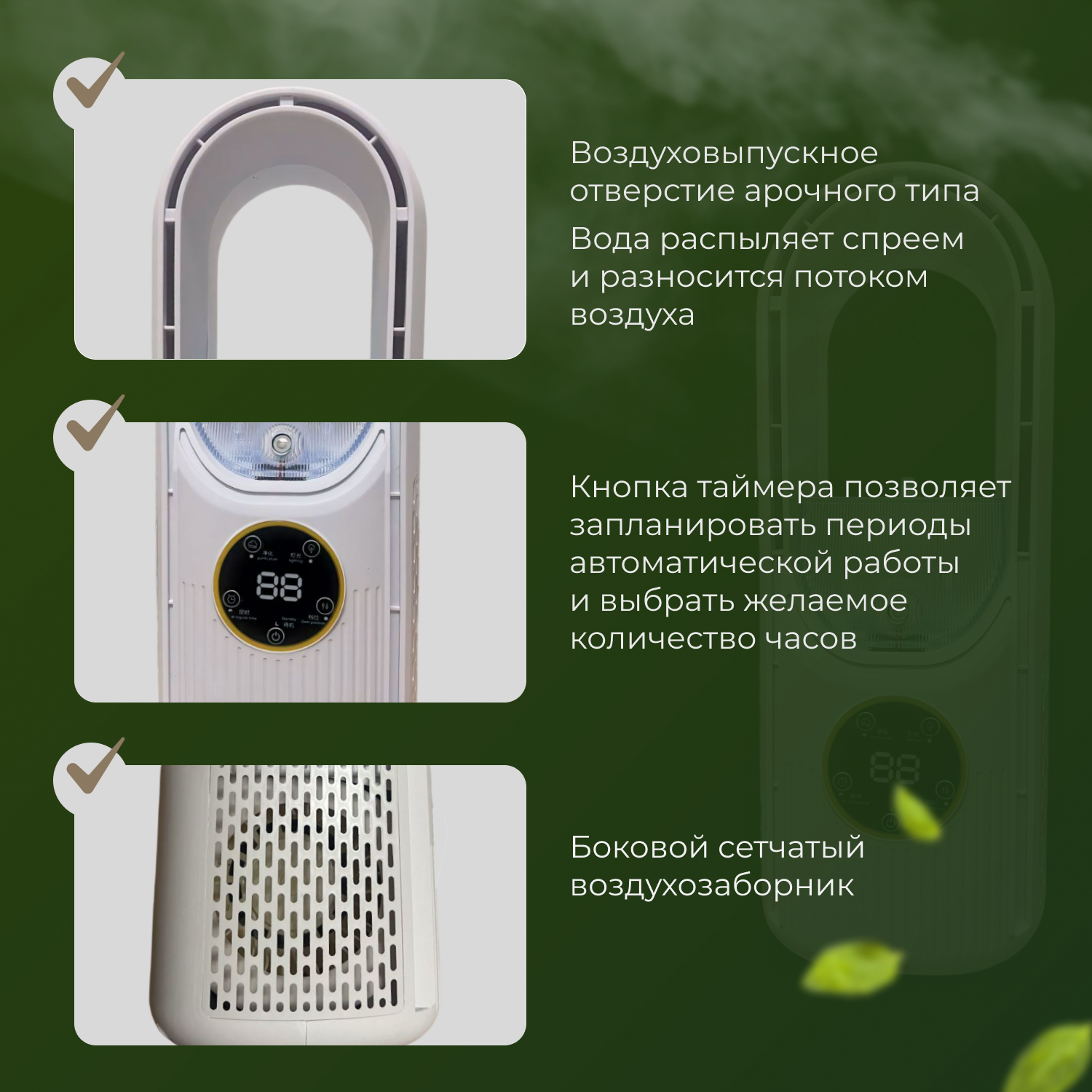 | Особенности | влагозащищенный корпус / дисплей / ионизация / пульт ДУ / таймер / увлажнитель |