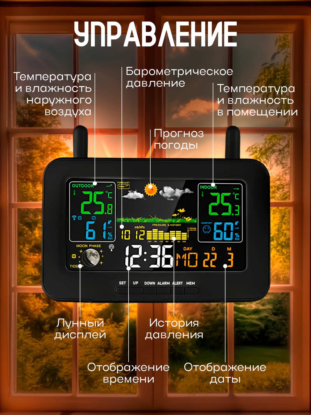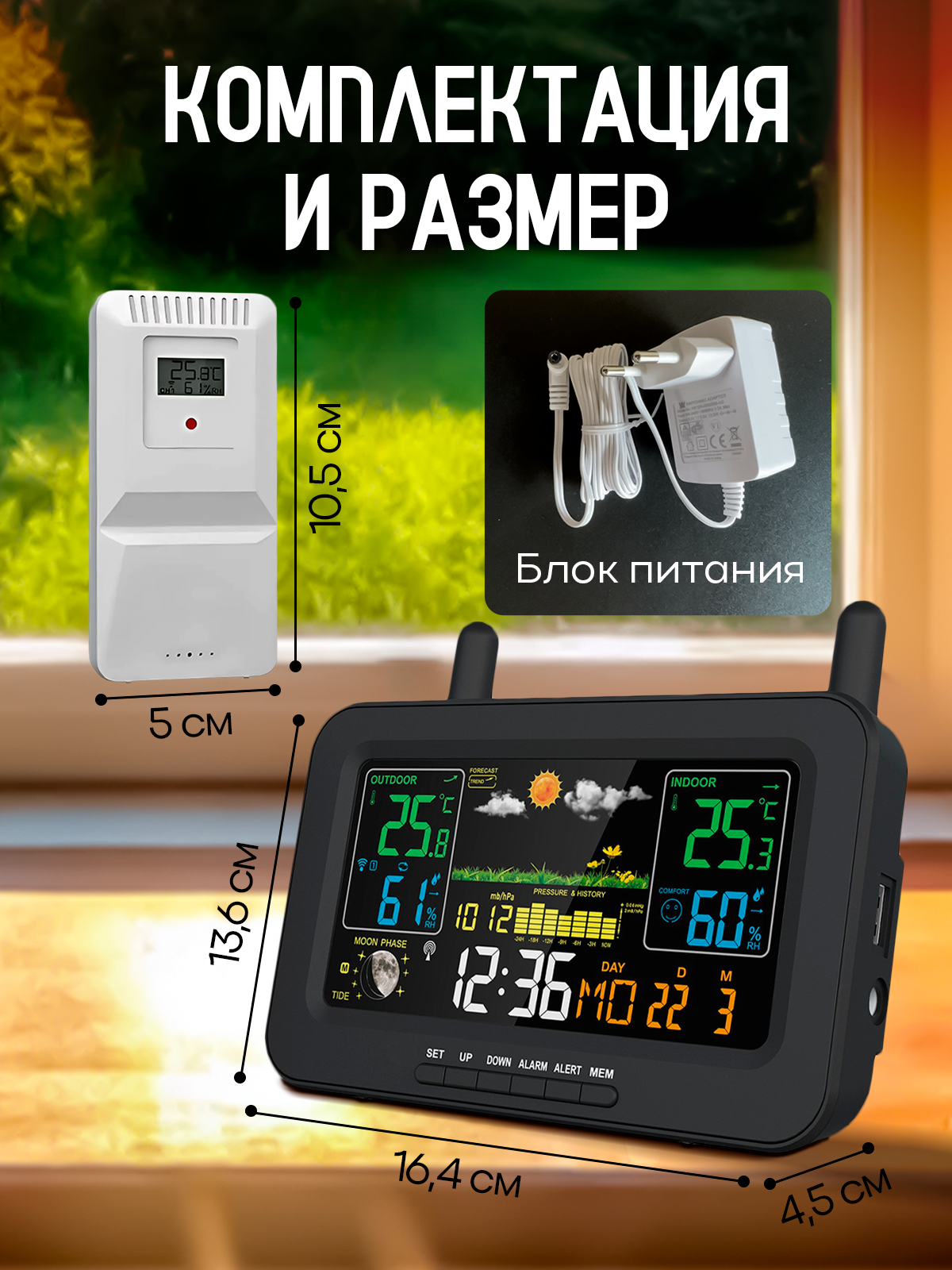 | Измерения | влажность в помещении / влажность на улице / давление / направление ветра / скорость ветра / температура в помещении / температура на улице |