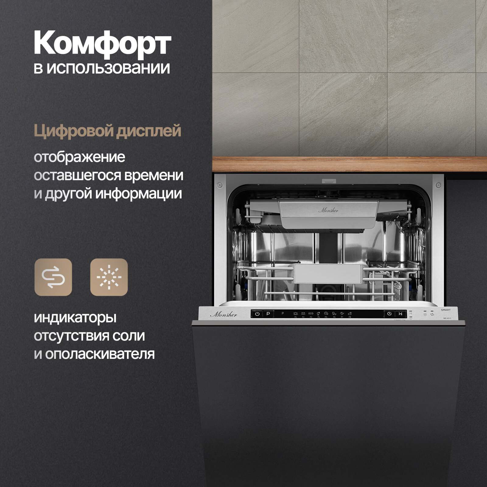 Встраиваемая посудомоечная машина Monsher MD 4515, с лучом на полу (Модификация 2024 года) интересное: