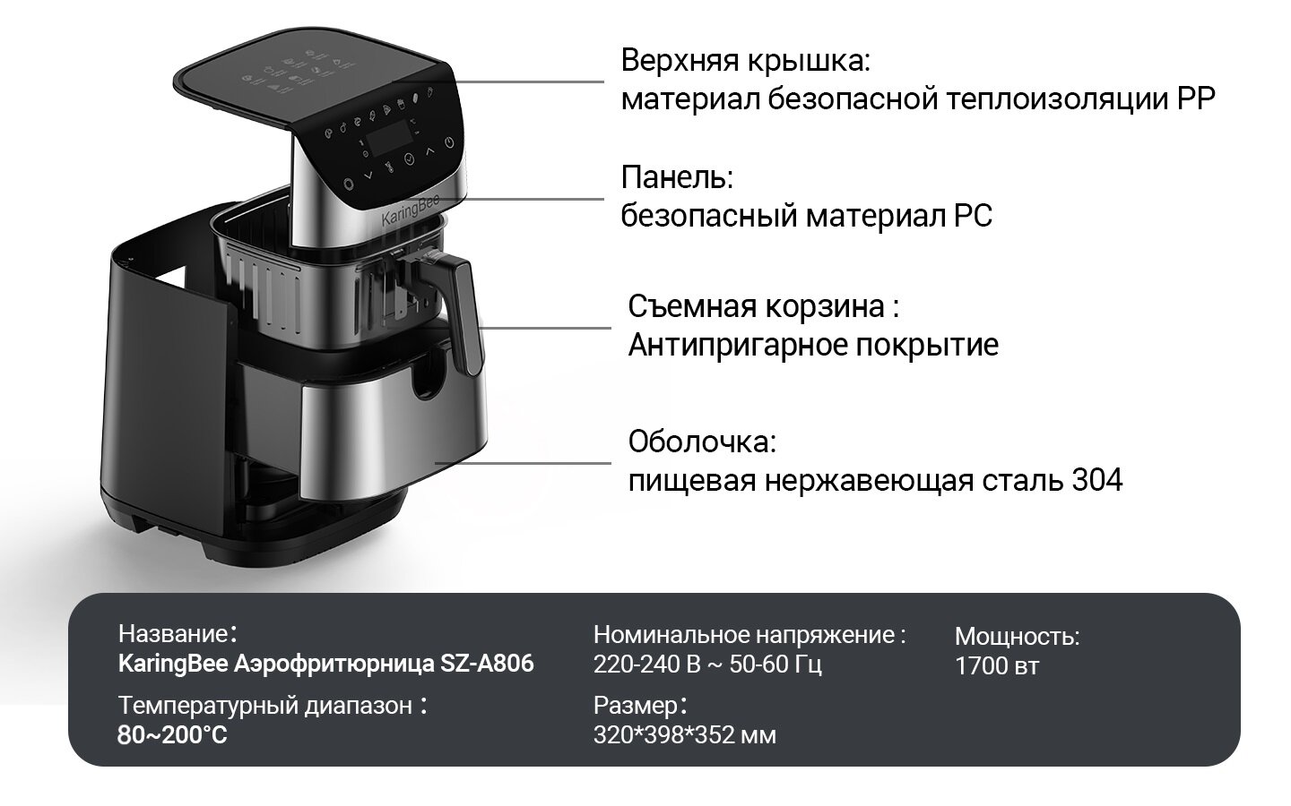 Купить Аэрогриль электрический KaringBee SZ-A806/Съемная корзина/Объем 8 л/8 функции/Автоматическое отключение