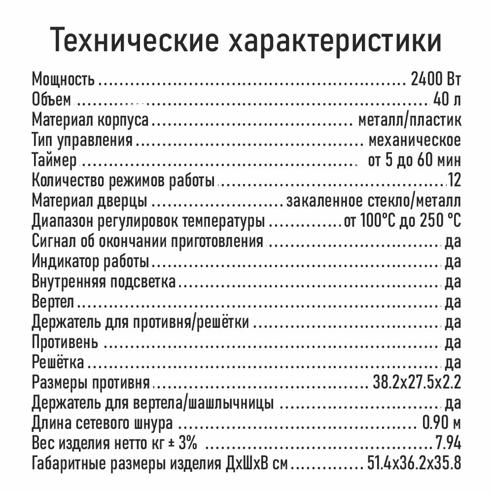 | Режимы | автоматические программы приготовления / верхний нагрев / верхний+нижний нагрев / конвекция / нижний нагрев |