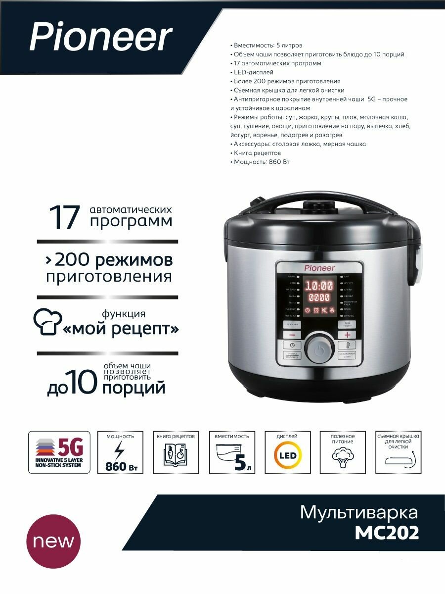 Купить Мультиварка Pioneer MC202 с чашей 5 л с антипригарным покрытием 5G, 17 автопрограмм, 200 режимов, "Мой Рецепт", йогурт, суп, плов, 860 Вт