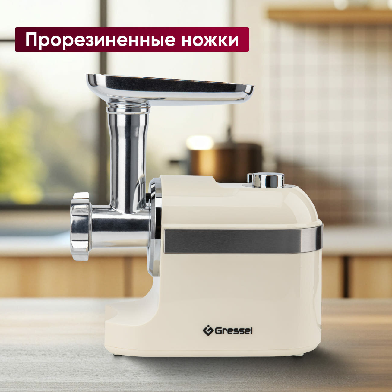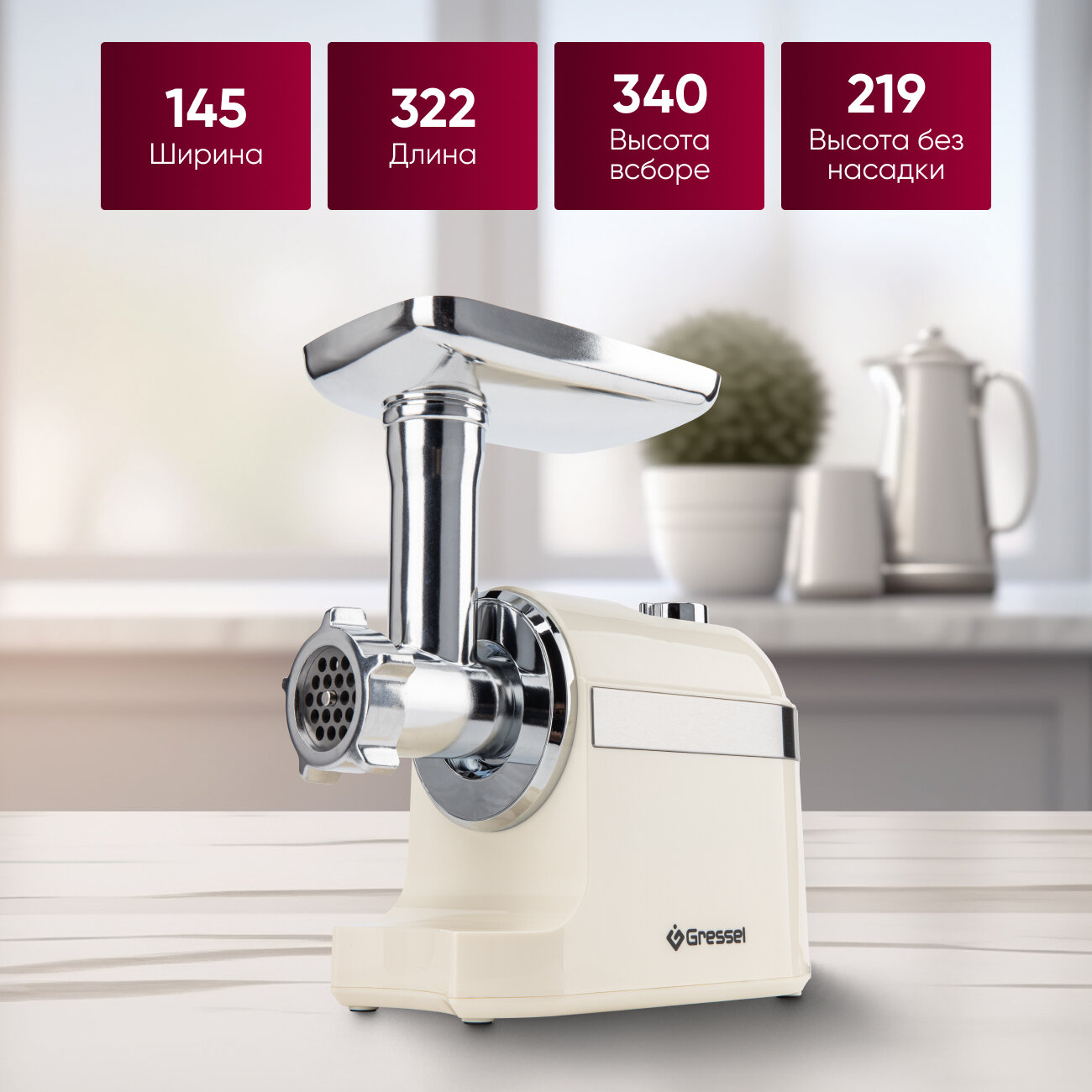 Мясорубка электрическая Gressel GMG-1704, кремовый, 2000Вт, насадки для кеббе и колбасок, 3 решетки для фарша интересное: