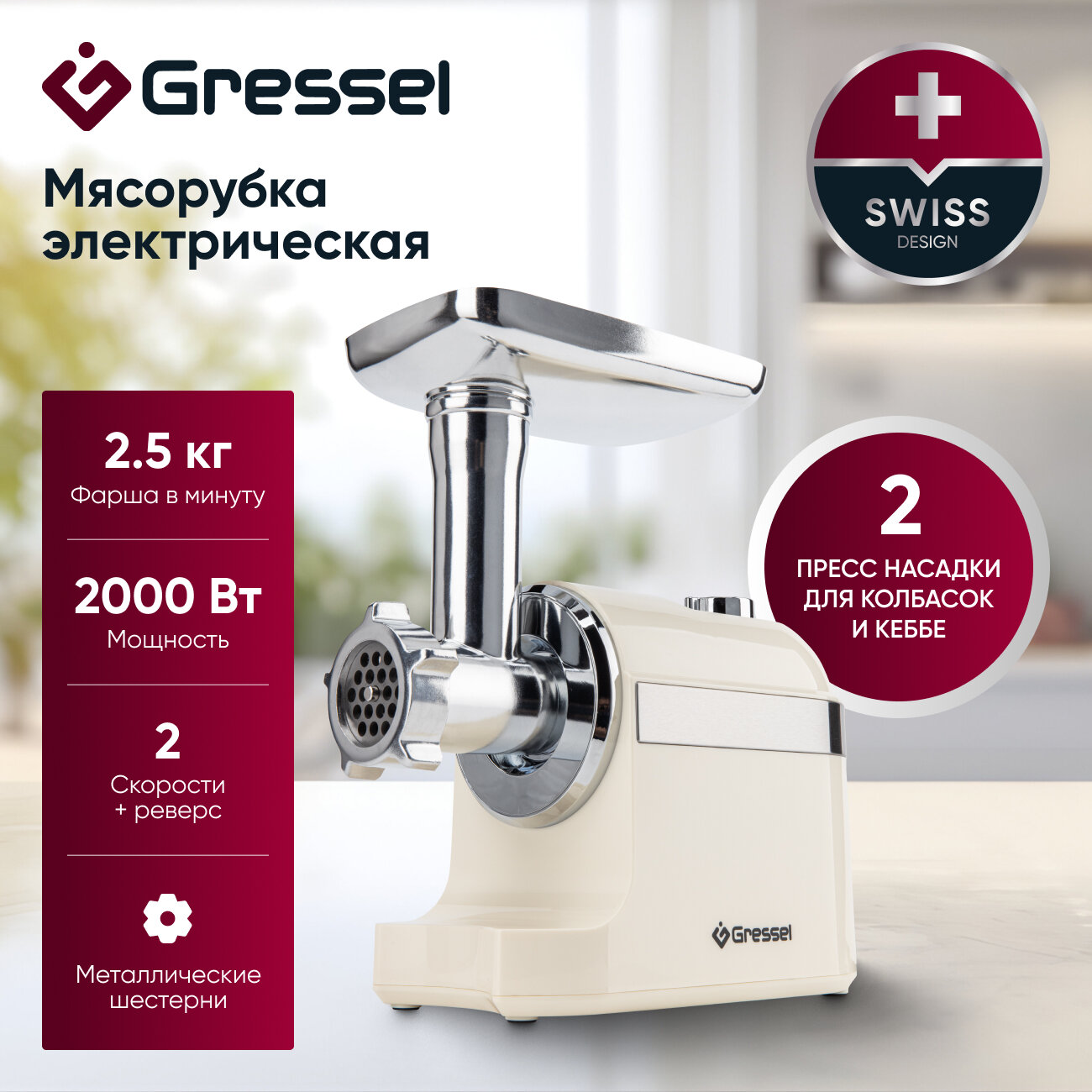 Купить Мясорубка электрическая Gressel GMG-1704, кремовый, 2000Вт, насадки для кеббе и колбасок, 3 решетки для фарша