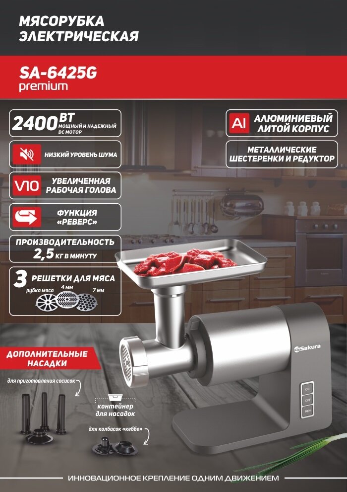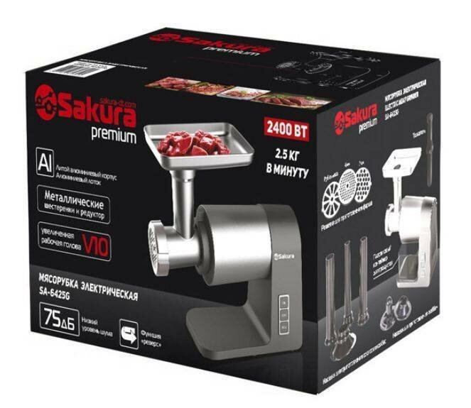 Мясорубка Sakura SA-6425G Premium 2400Вт, реверс, комплект насадок интересное: