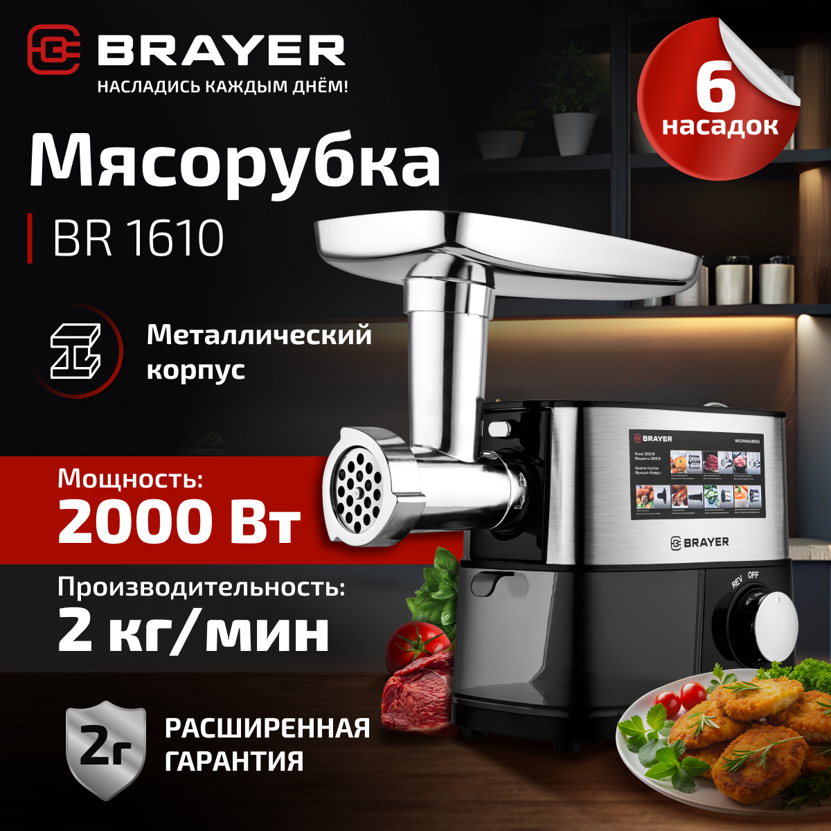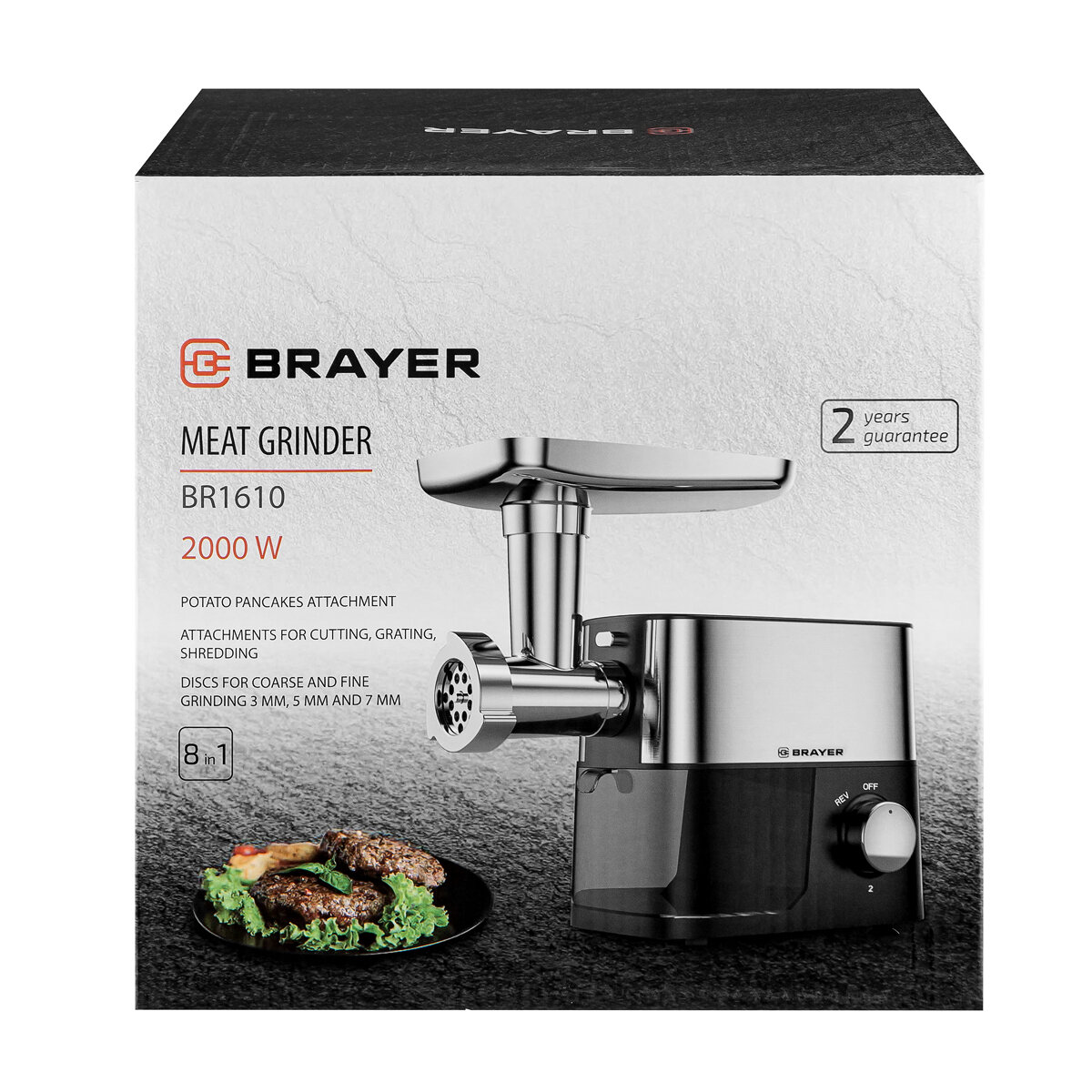 Мясорубка BRAYER BR1610, 2000 Вт, 3 диска, овощерезка, реверс, 2 кг/мин