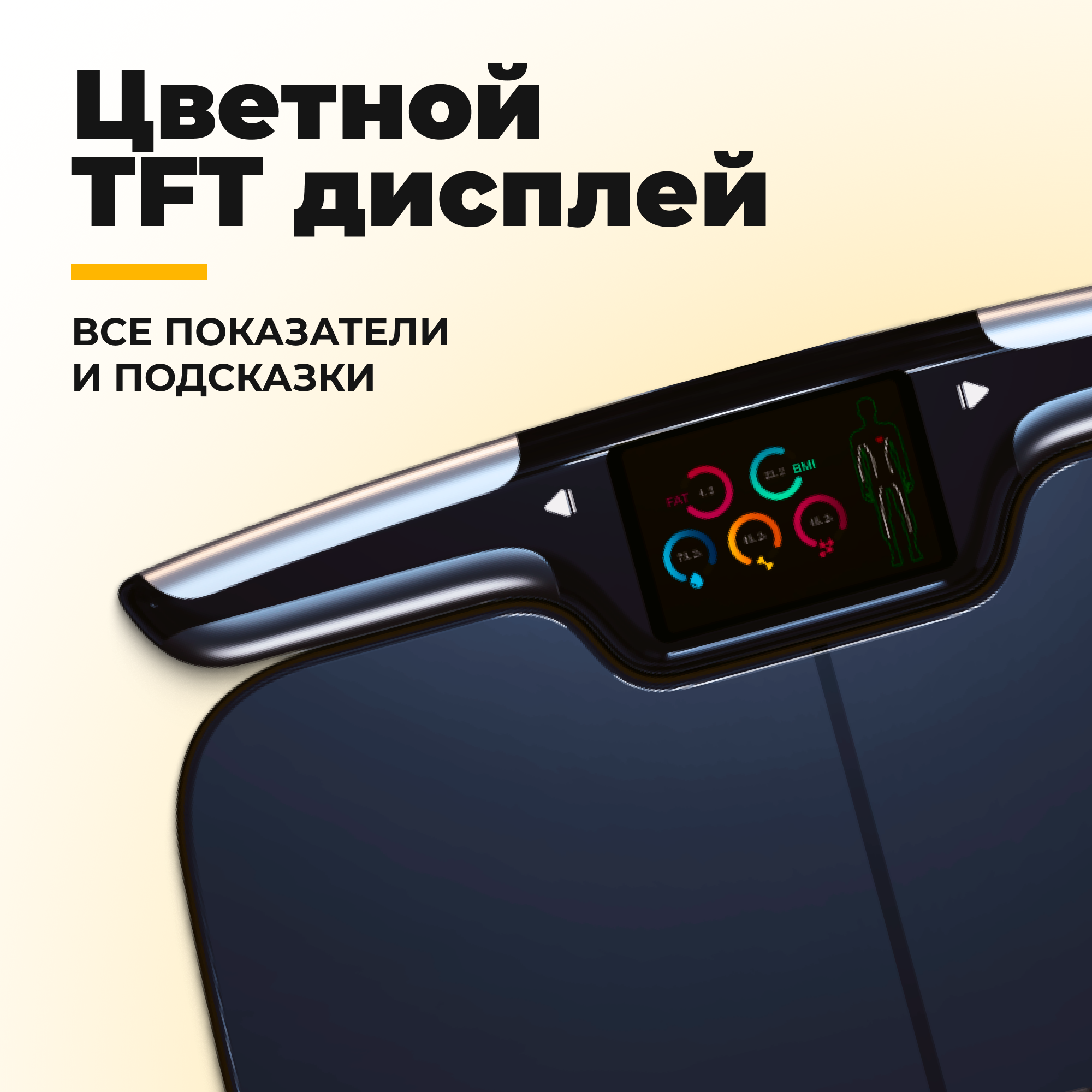 | Дополнительная информация | Комплексный анализ состояния тела; Синхронизируют данные с мобильным приложением; За одно взвешивание весы измеряют 14 важных показателей; Подсветка дисплея; Цветной экран; Выдвижная панель; Высокая точность измерений; Функция автоотключения/ включения; Цветной TFT дисплей |