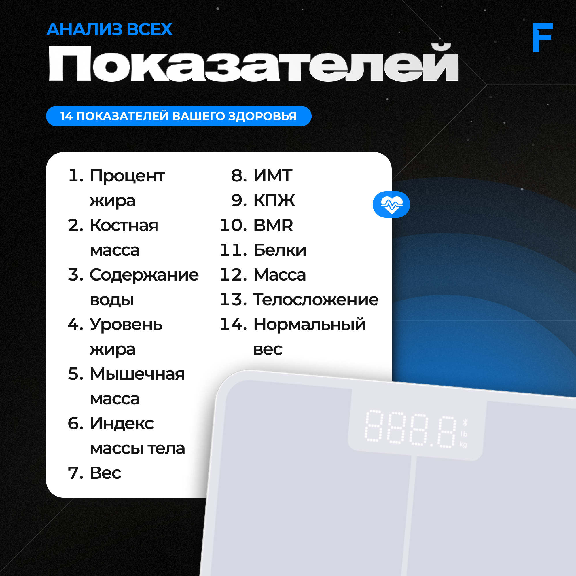 | Дополнительные функции | определение доли воды / определение доли жировой ткани / определение доли костной ткани / определение доли мышечной ткани / память / постановка цели / расчет ИМТ (BMI) |
