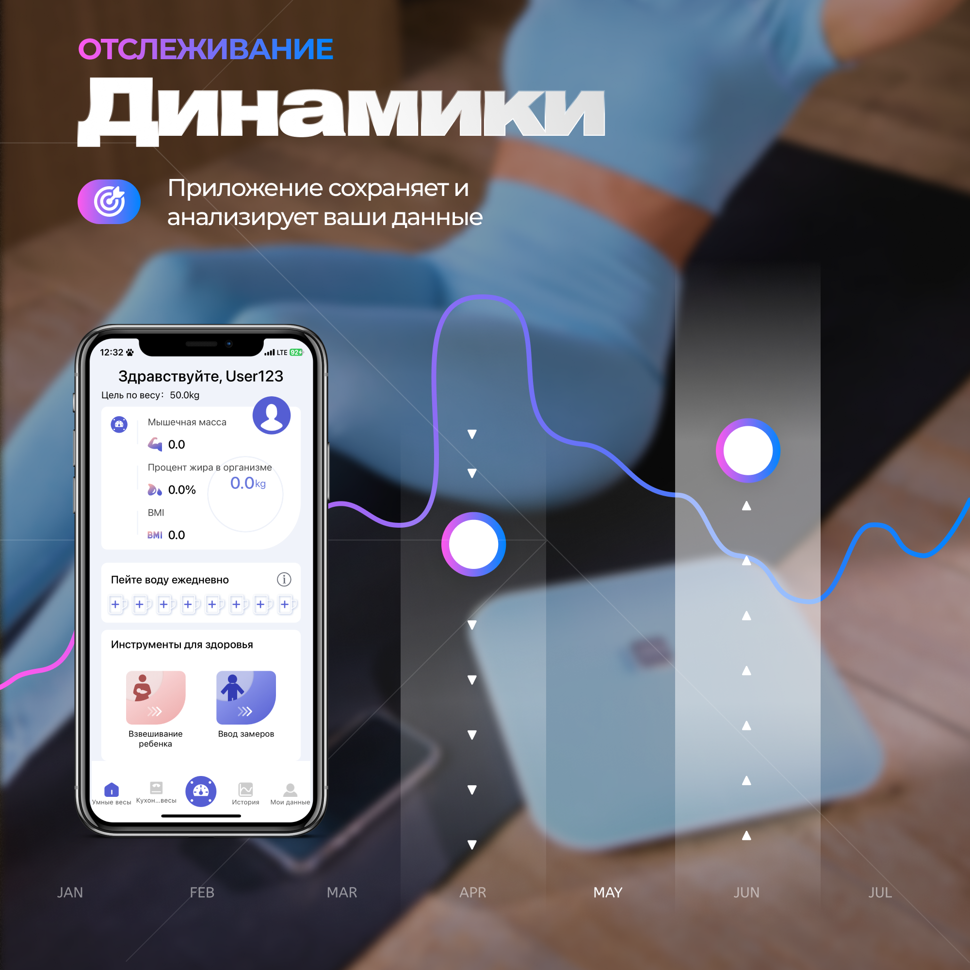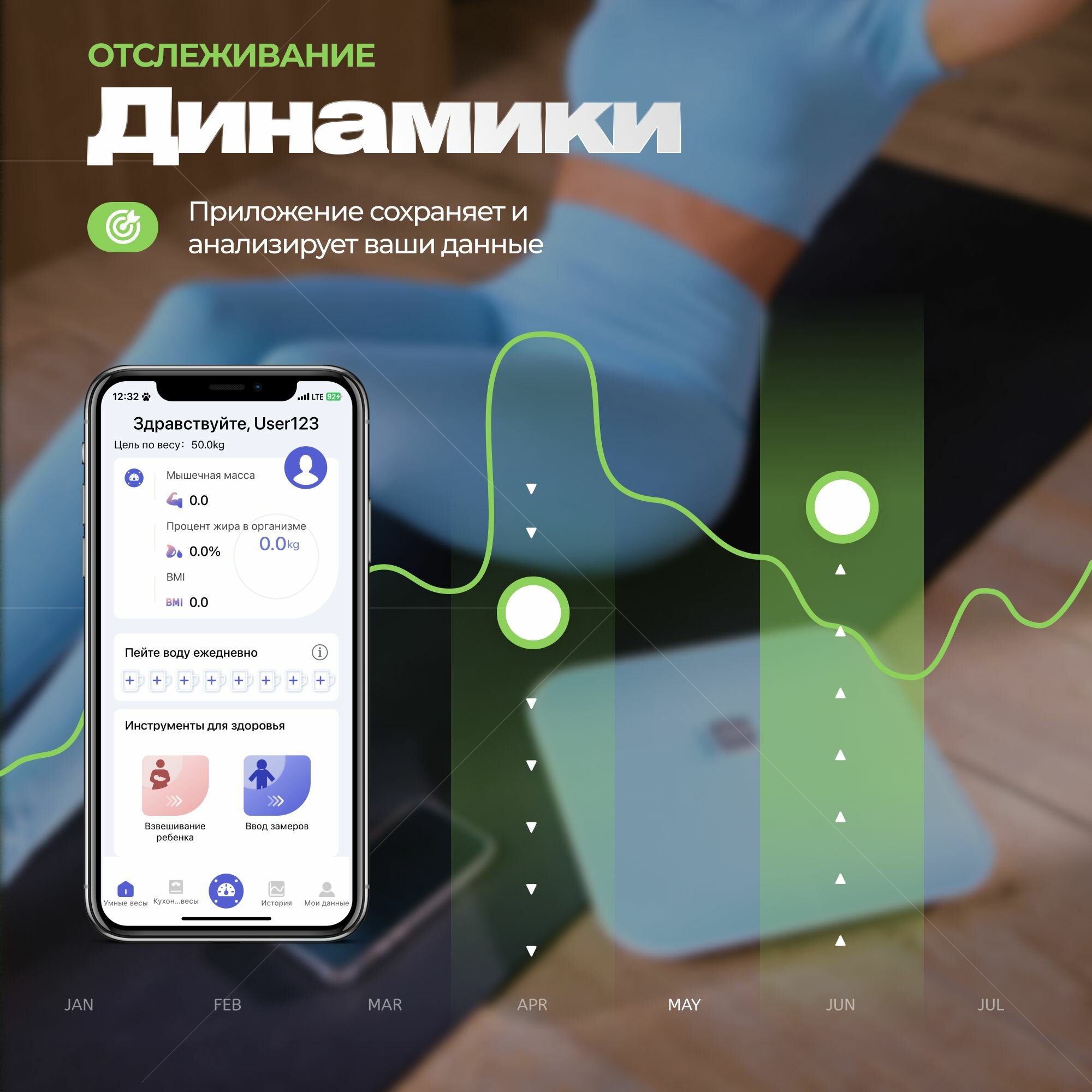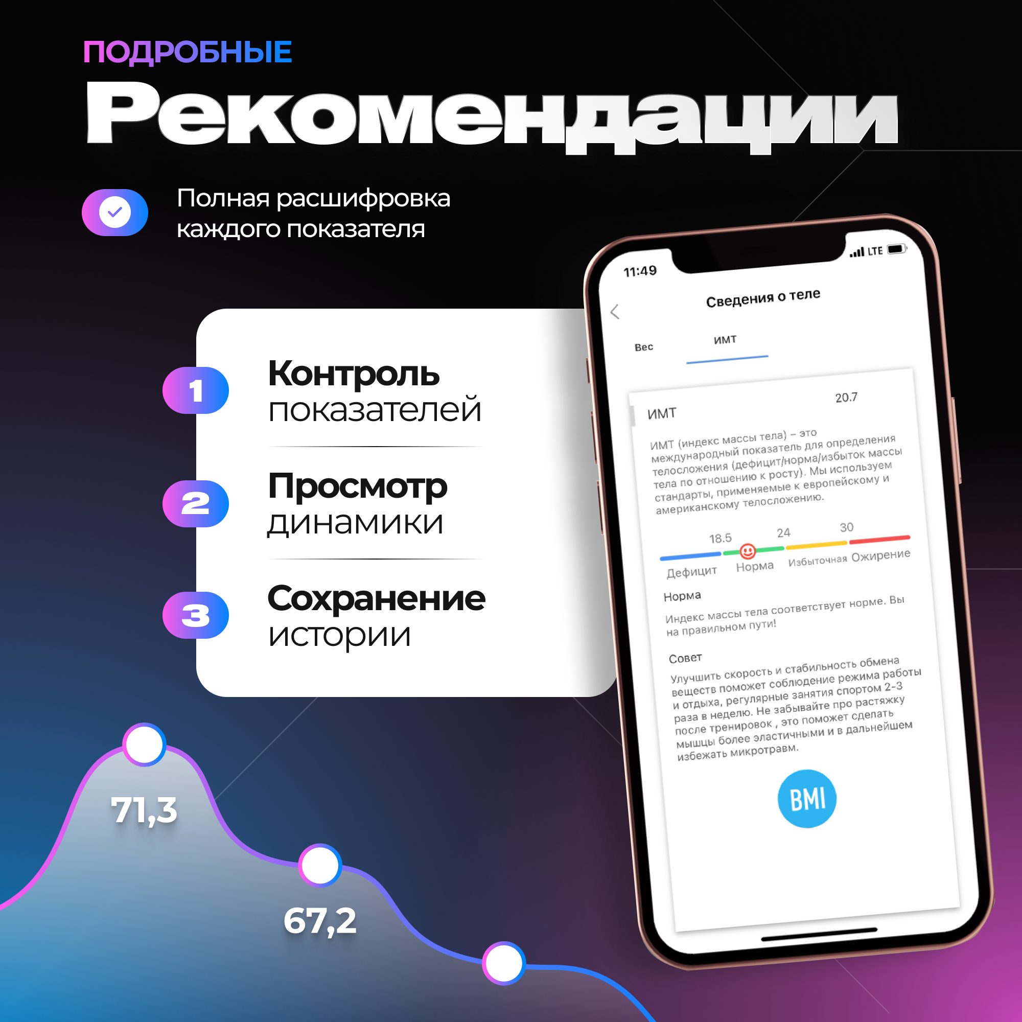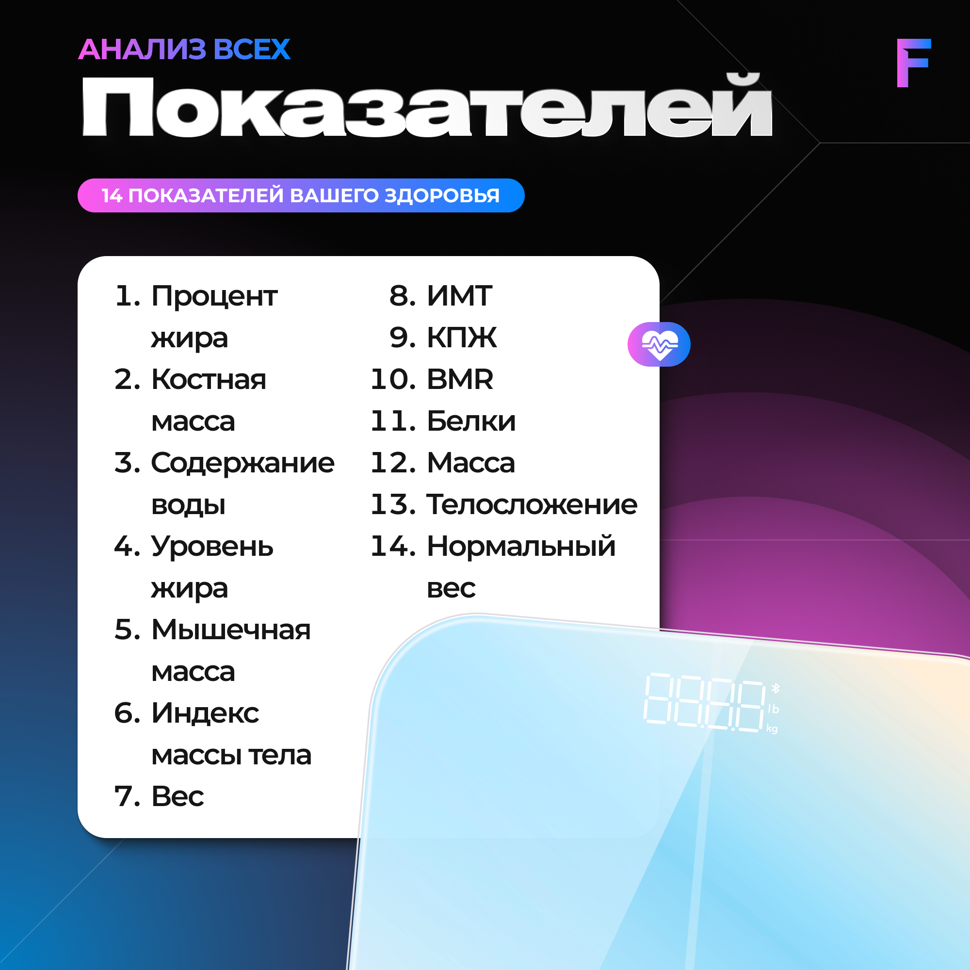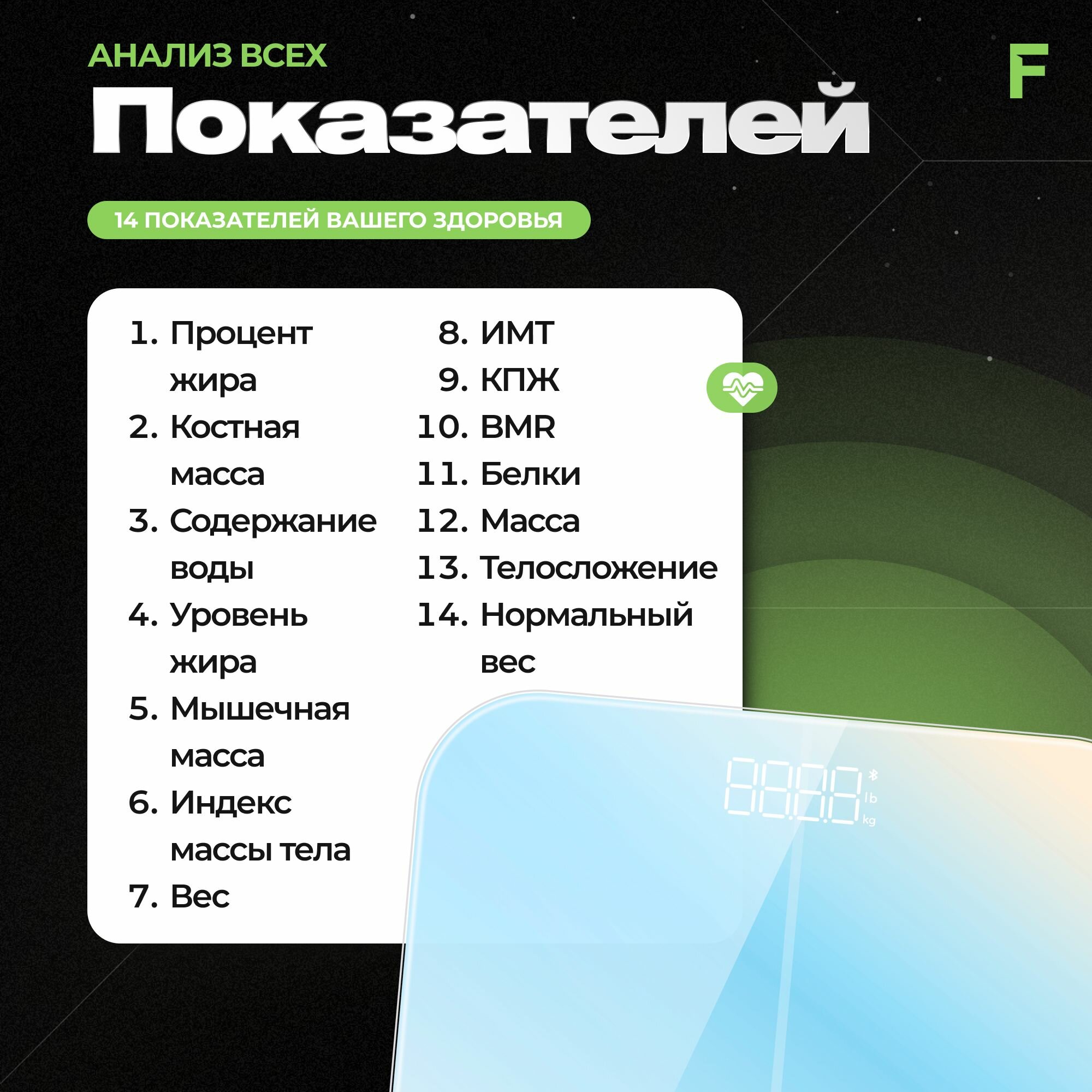 | Дополнительная информация | Комплексный анализ состояния тела; Синхронизируют данные с мобильным приложением; За одно взвешивание весы измеряют 14 важных показателей; Подсветка дисплея; Цветной экран; Выдвижная панель; Высокая точность измерений; Функция автоотключения/ включения; Цветной TFT дисплей |