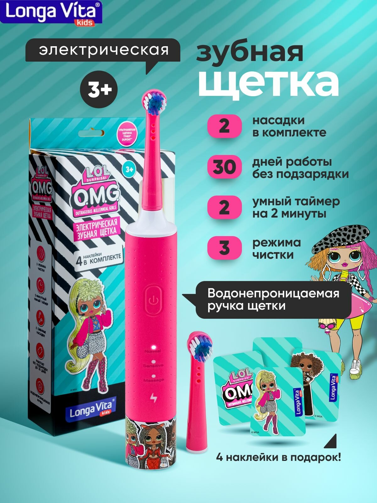 Купить Детская электрическая зубная щётка Longa Vita L.O.L O.M.G., ротационная 2 насадки от 3-х лет