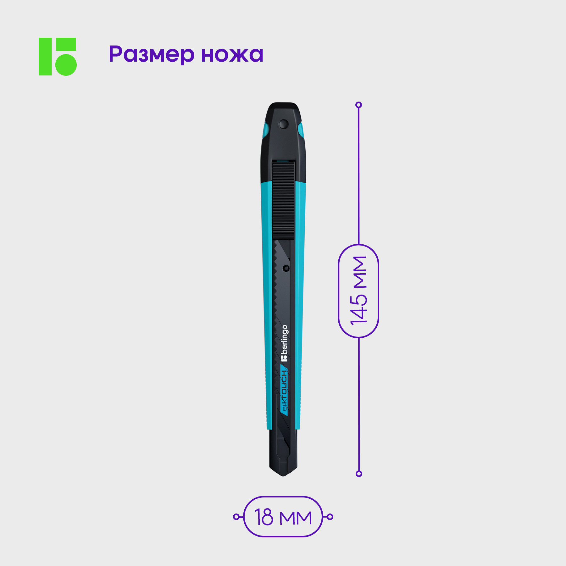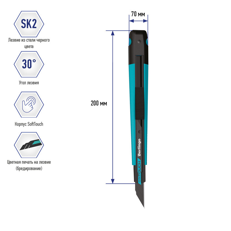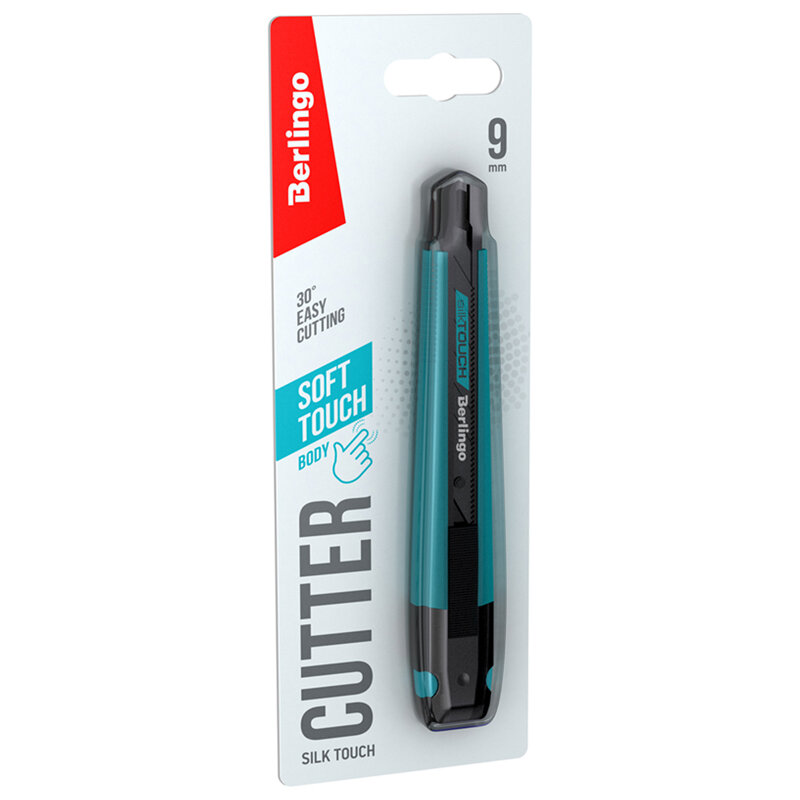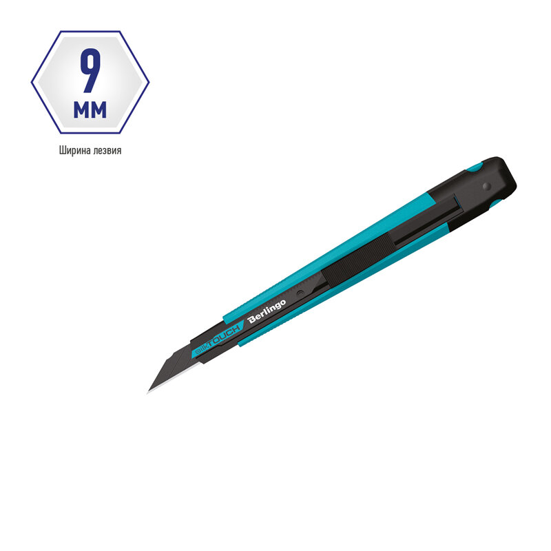 | Подробная комплектация | Нож канцелярский 9мм Berlingo "SilkTouch", черное лезвие, auto-lock, металл. направл., европодвес - 1 шт |