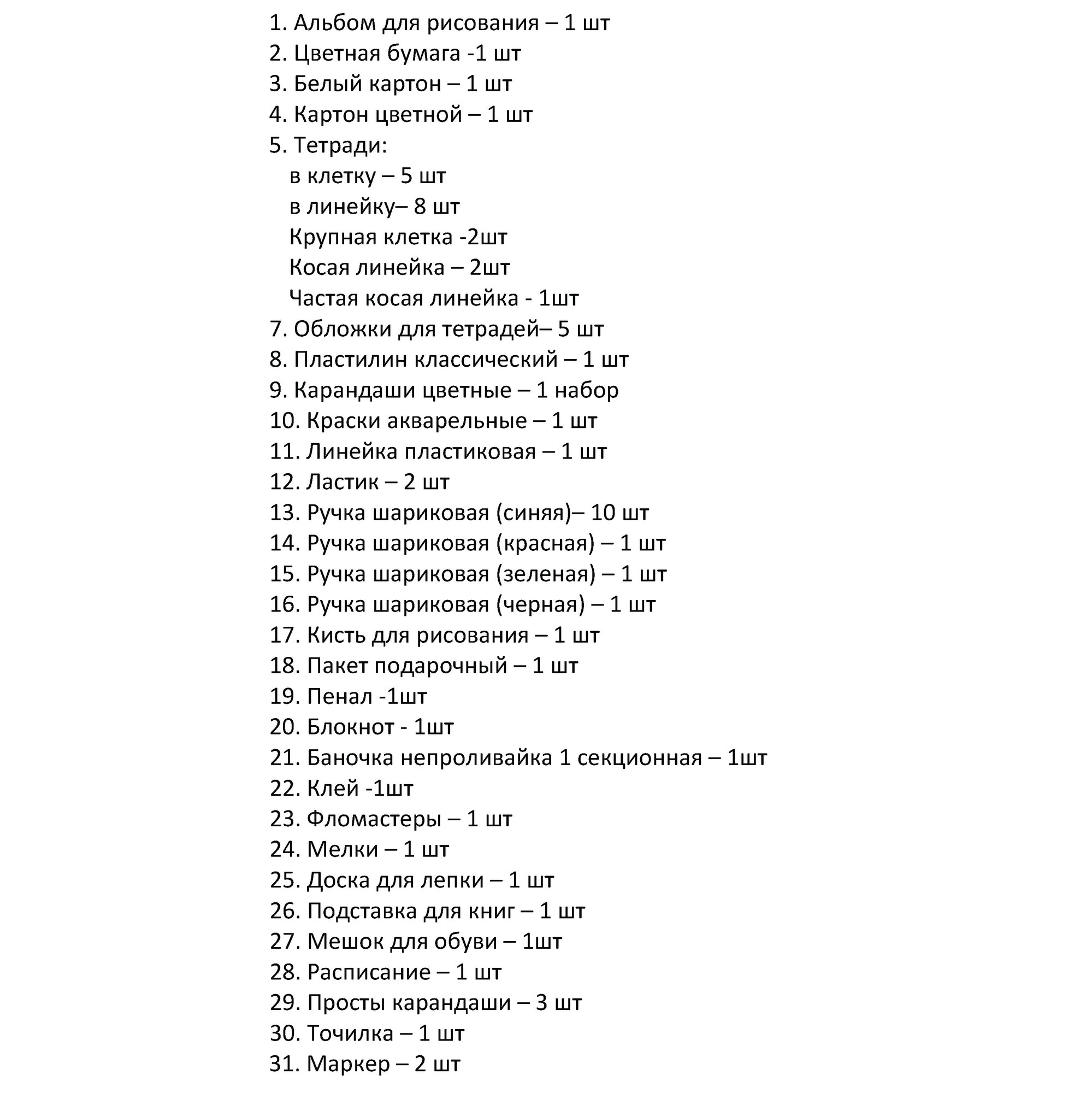 | В комплекте | 1.Альбом для рисования – 2 шт 2.Цветная бумага. -1 шт 3.Белый картон. – 1 шт 4.Картон цветной. – 1 шт 5.Тетрадь в клетку. – 5 шт 6.Тетрадь в линейку.– 20 шт .Обложки для тетрадей– 5 шт 8.Пластилин классический. Россия – 1 шт 9.Карандаши цветные – 1 шт 10.Краски акварельные – 1 шт 11.Линейка пластиковая – 2 шт 12.Карандаш простой -10шт 13.Ластик – 2 шт 14.Ручка шариковая (синяя).– 20 шт 15.Ручка шариковая (красная). – 1 шт 16.Ручка шариковая (зеленая). – 1 шт 17.Ручка шариковая (черная). – 1 шт 18.Кисть для рисования.– 1 шт 19.Пакет подарочный. Россия – 1 шт 20. Мешок для сменки. - 1 шт 21. Блокнот -2шт 22. Баночка не проливайка 1 секционная -1шт 23. Клей -1шт 24. Пенал -1шт 25. Корректирующая лента -1шт 26. Подставка для книг -1шт |