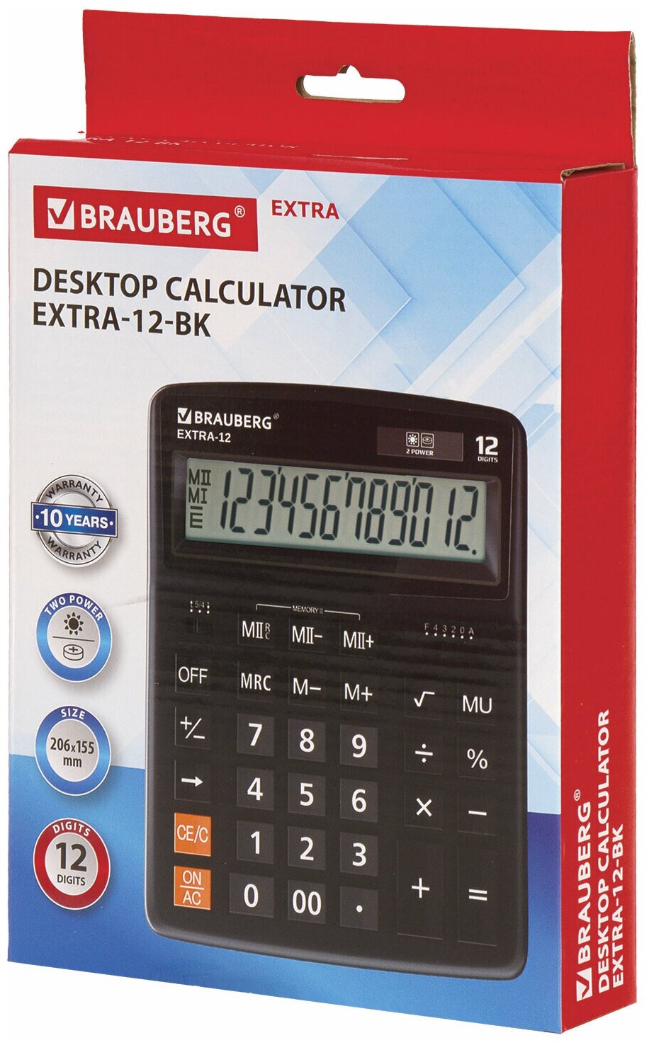 Калькулятор настольный BRAUBERG EXTRA-12-BK, 12-разрядный, 206 x 155 мм, двойное питание, чёрный