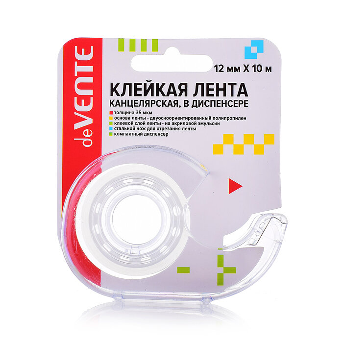 Скотч канцелярский 12*10 deVente, 35мкм, прозрачный, пластиковая втулка, в пластиковом диспенсере арт.4162107. Количество в наборе 12 шт. интересное: