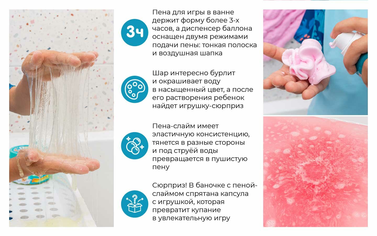 | Комплектация | Пена для игры в ванной розовая, 200мл. - 1 шт., Детский бурлящий шар/бомбочка для ванны розовый - 1 шт., Детская пена для ванны Душистая ваниль, 300 мл. - 1 шт., Набор для упаковки подарков с цветной бумагой - 1 шт. |