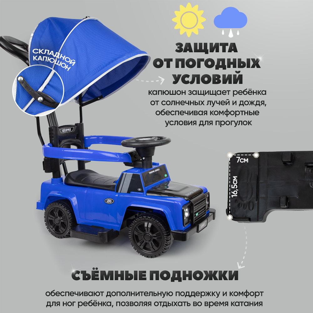 Каталка толокар с ручкой, свет, звук, капюшон, синяя интересное: