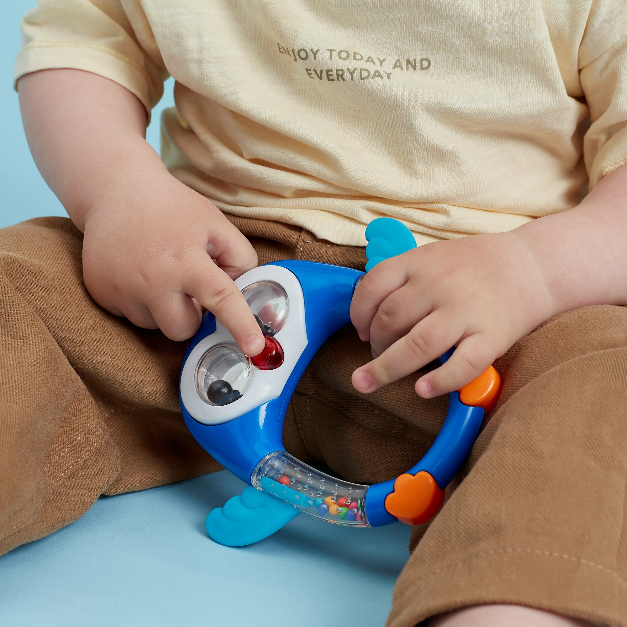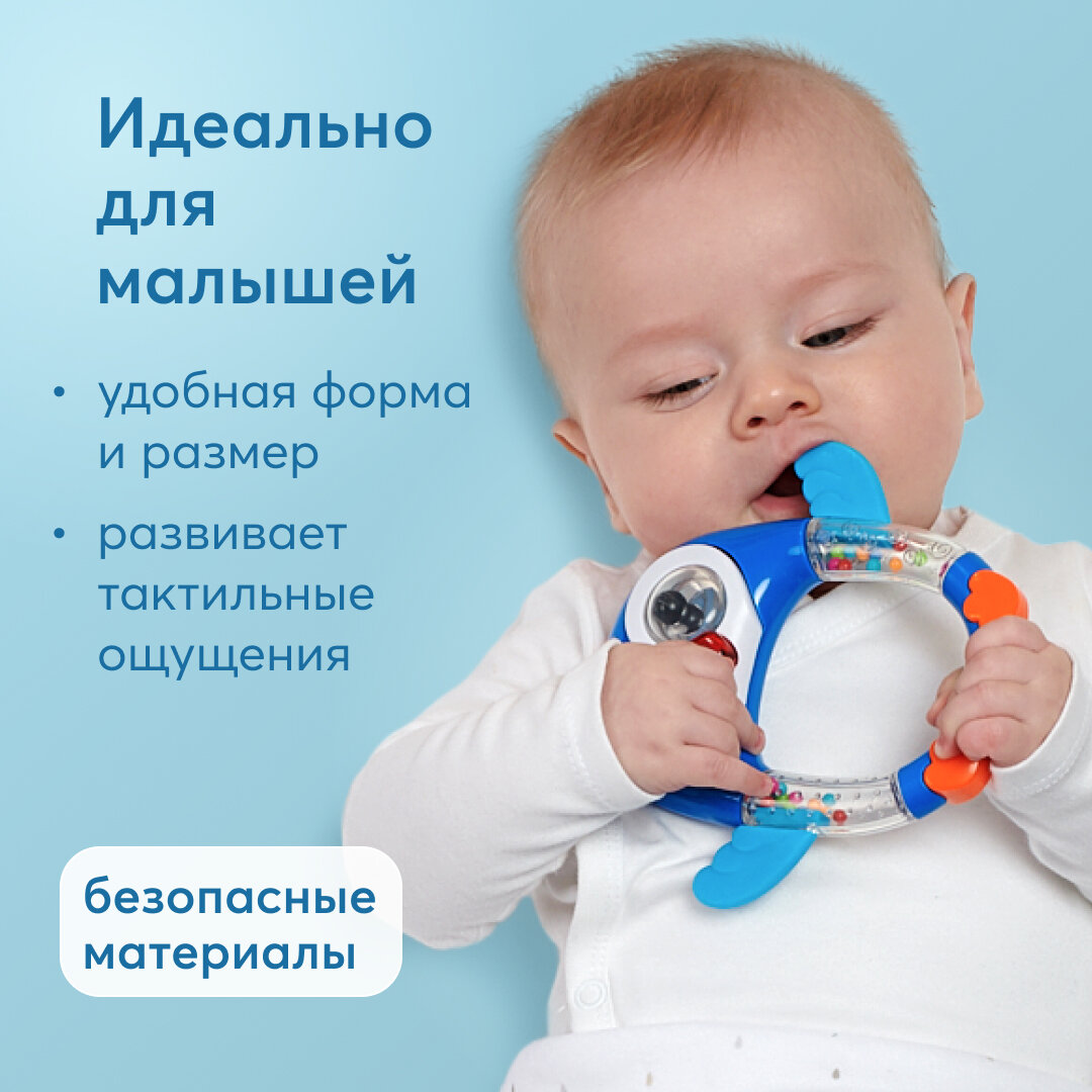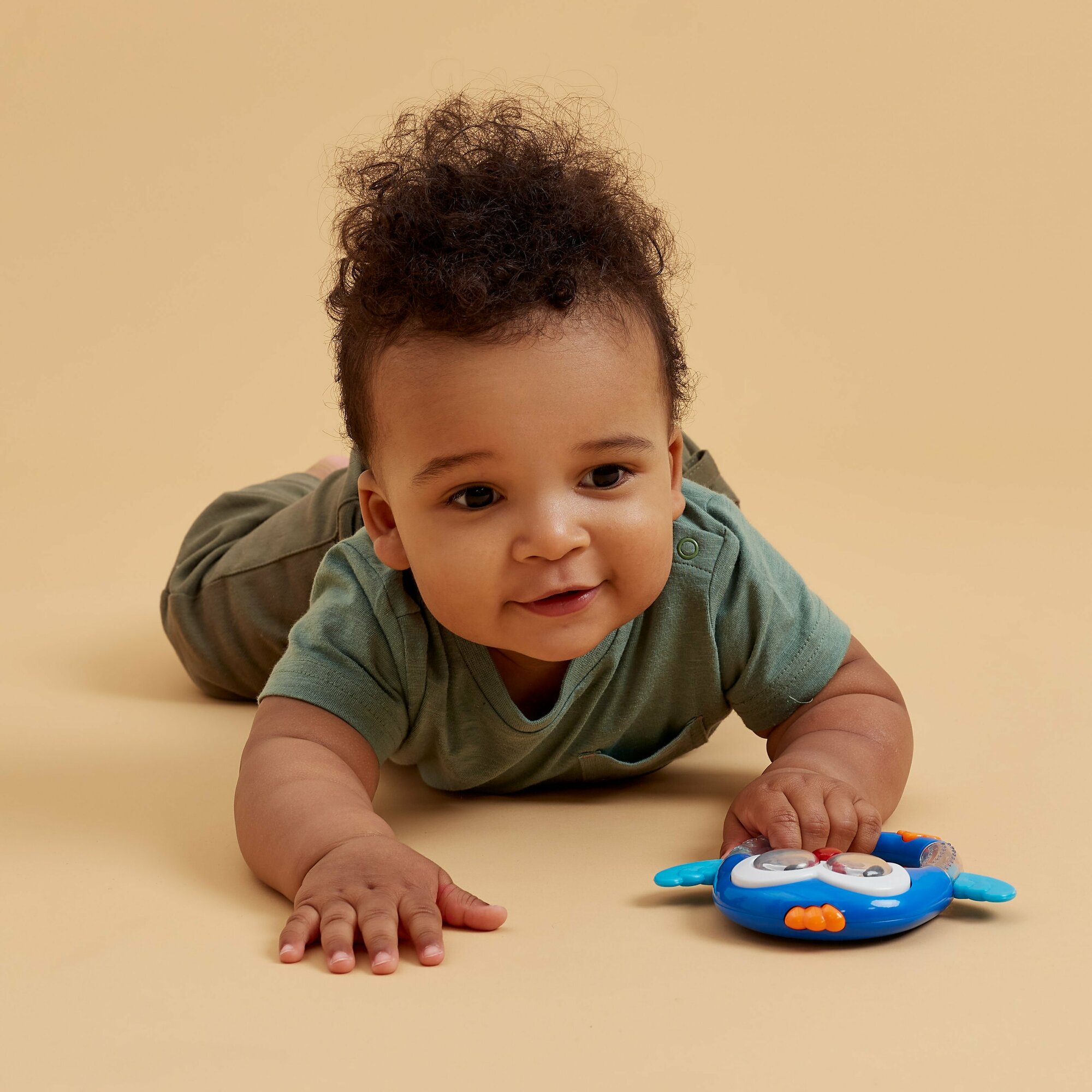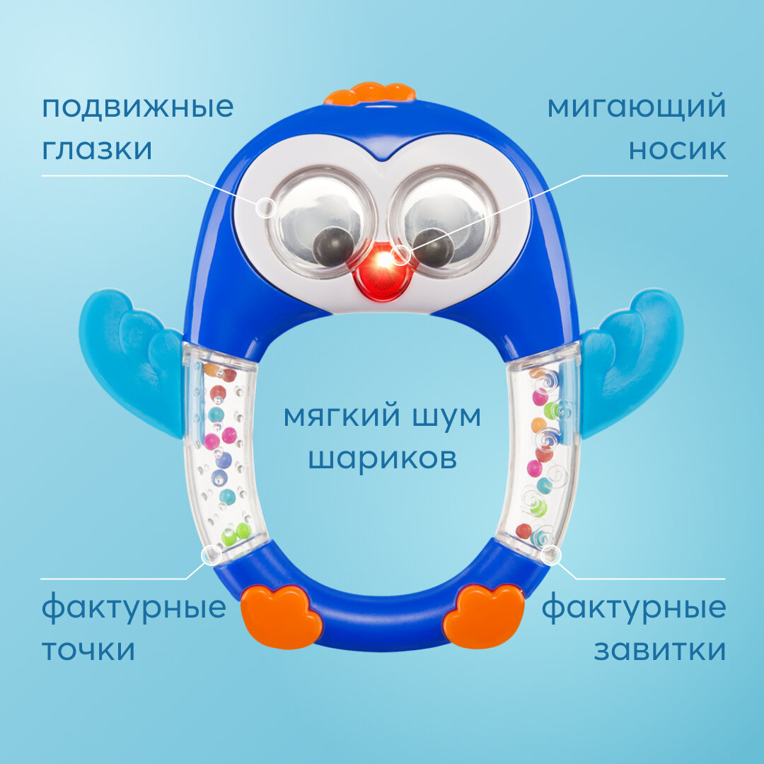 Пингвинчик понравился малышке 6 мес.,удобно держать,при встряхивании издает звуки и играет музыка,носик светится,удобно грызть крылышки.