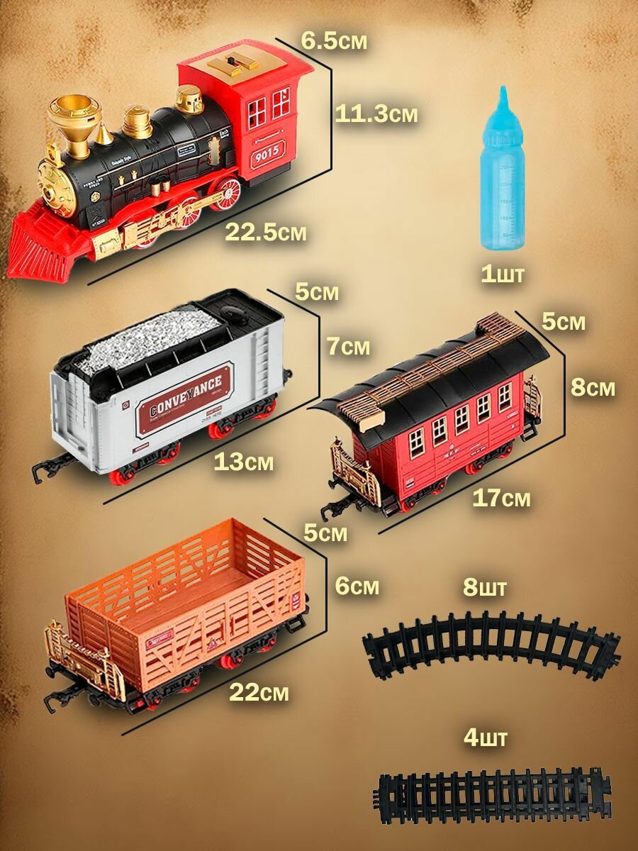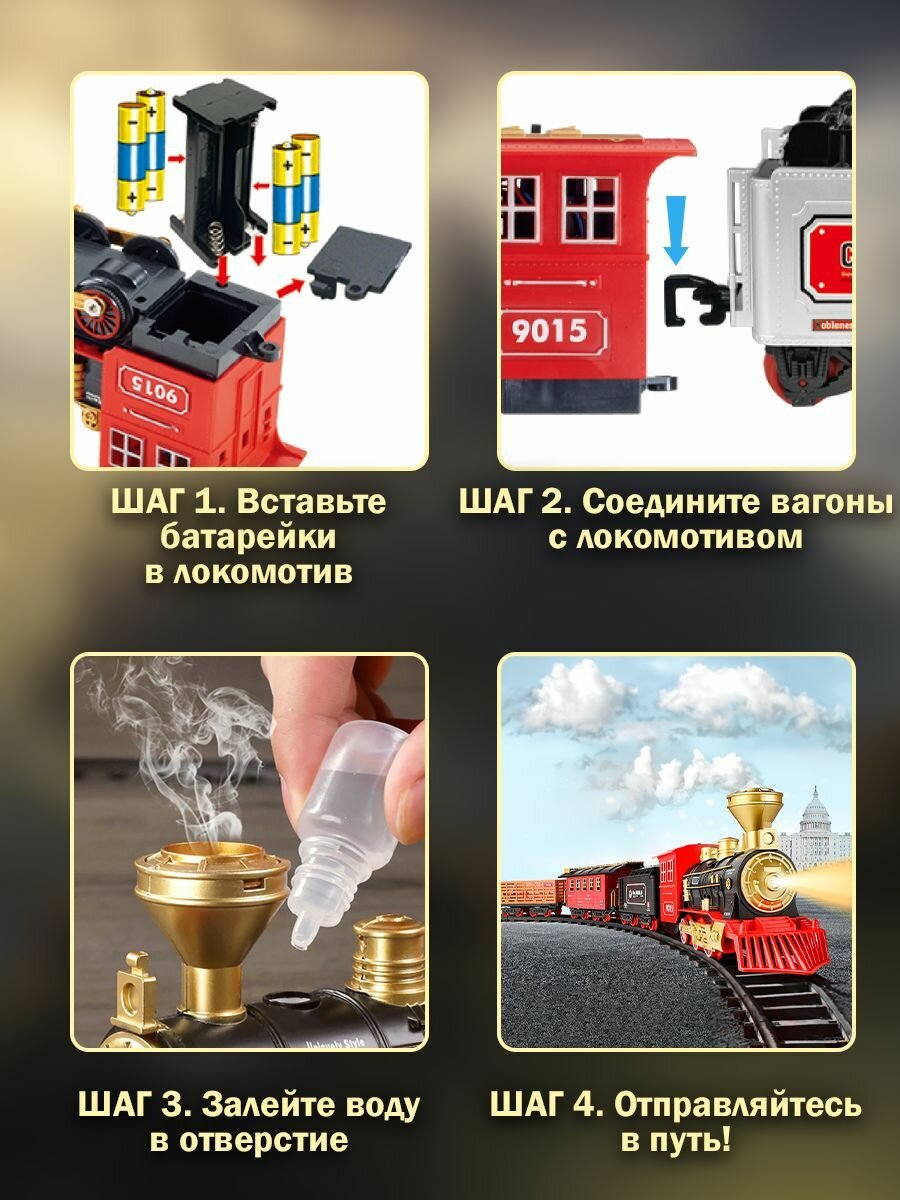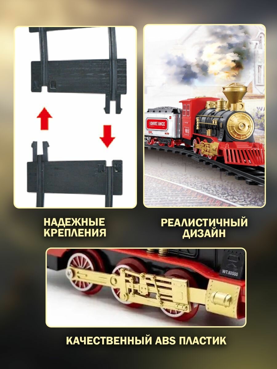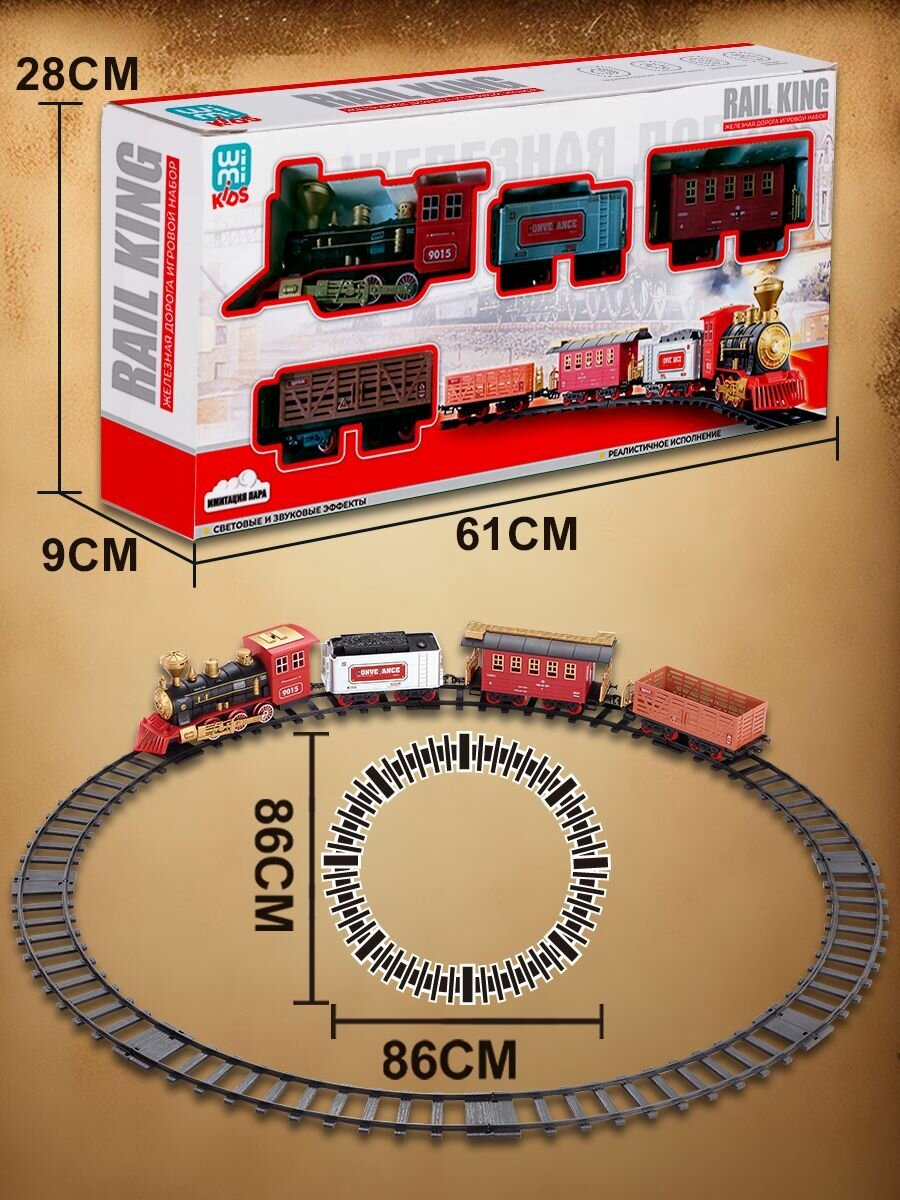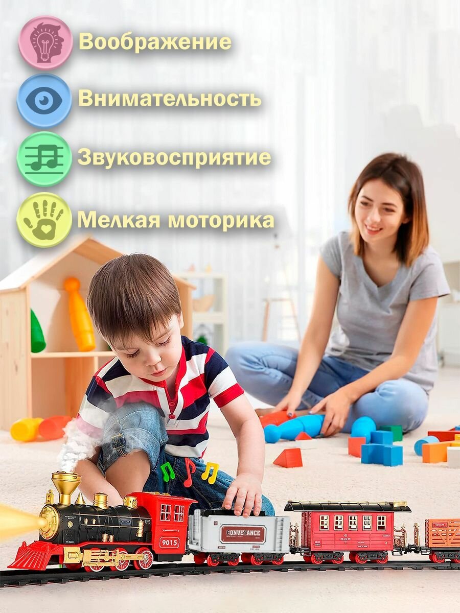 | Дополнительная информация | поезд с рельсами, большая железная дорога, световые и звуковые эффекты, дым |