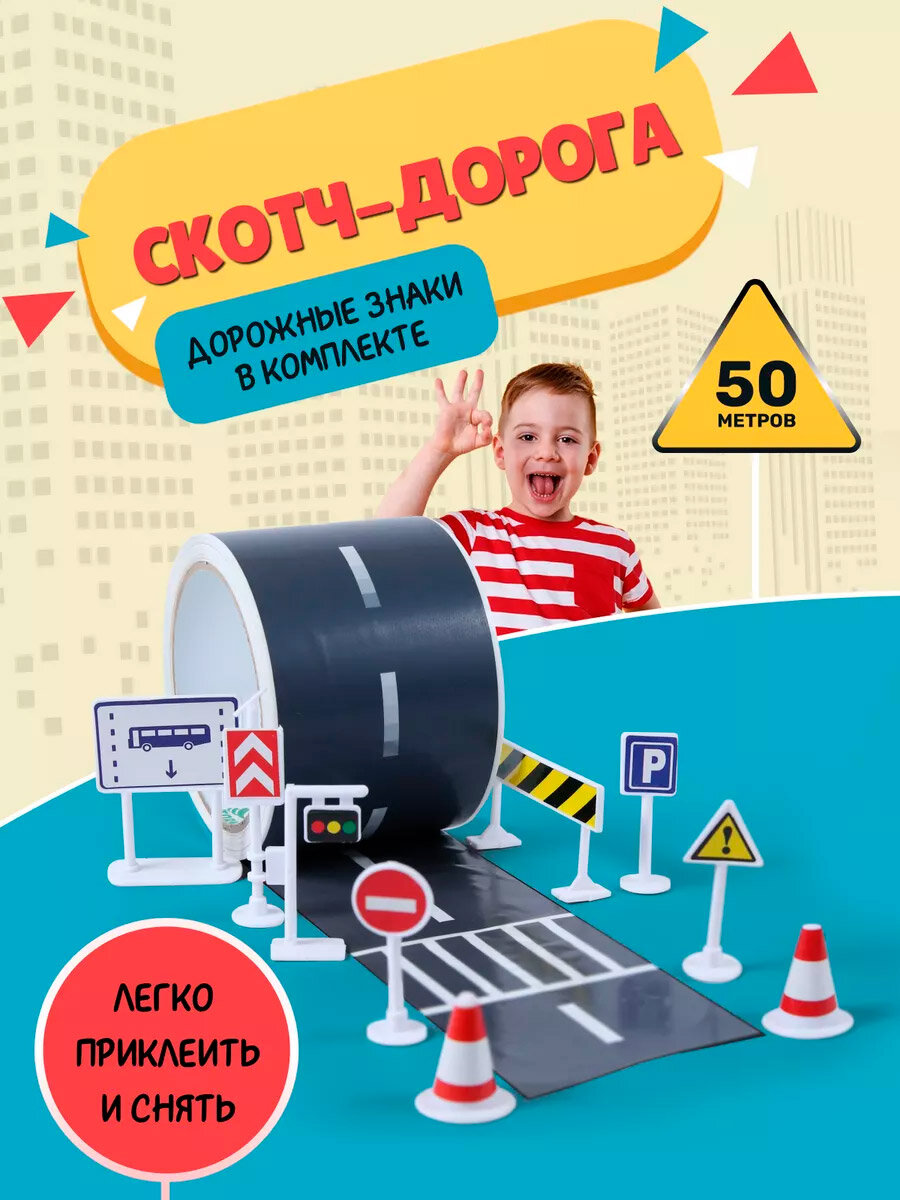 Купить Детский набор игровой скотч дорога парковка 72мм х 50 м / Дорожные знаки