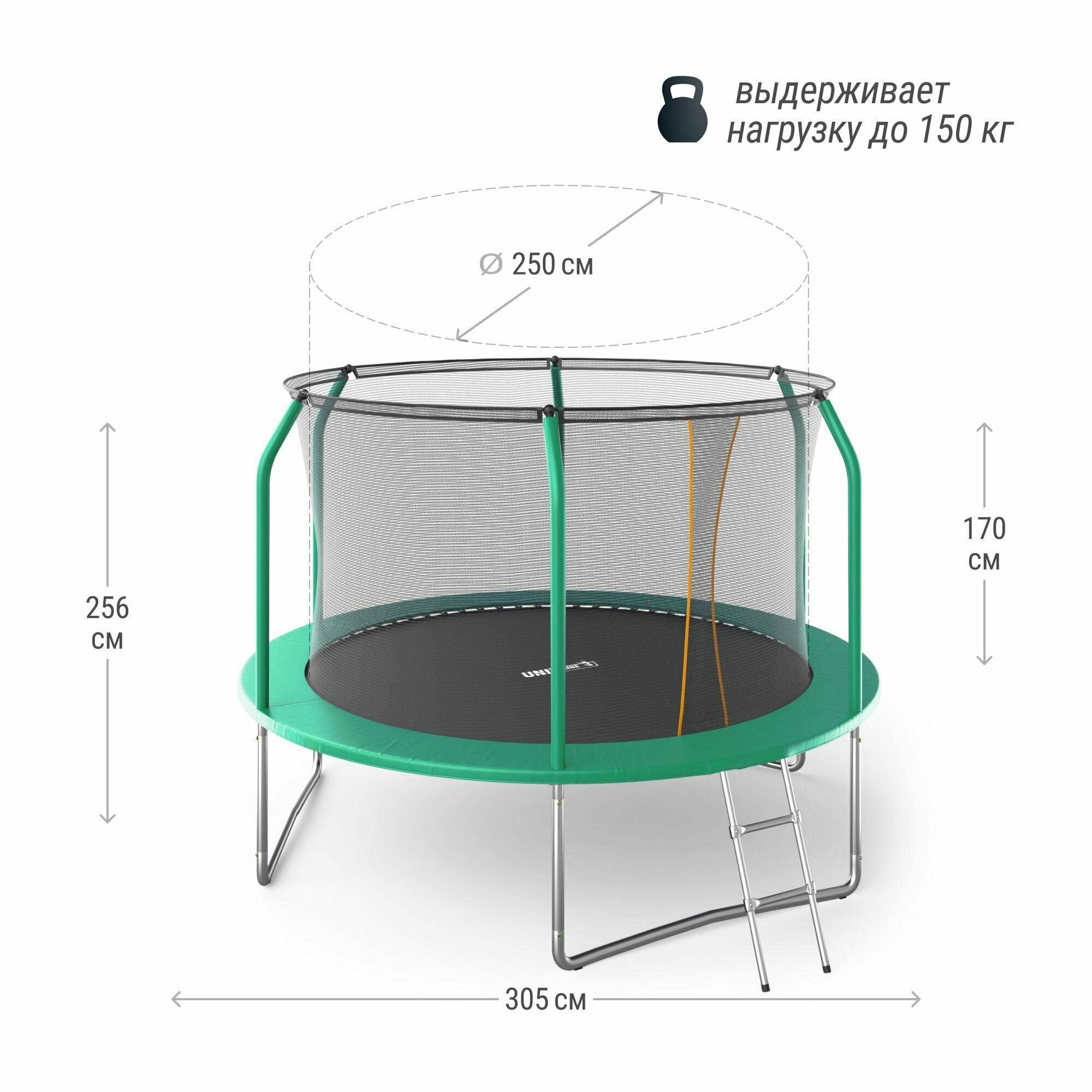 | Состав набора | Батут Защитный мат Защитная сеть Лестница Инструкция на русском языке |