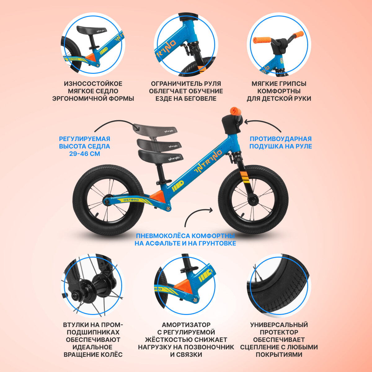 Купить Беговел Intrino Astero детский 1.5+ с амортизатором, высокий руль, рама алюминий морская волна